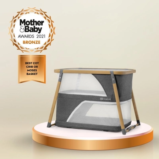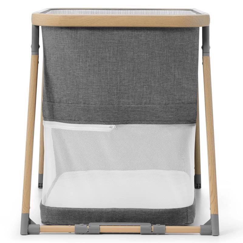 Panele z siatki wspierają cyrkulację powietrza i umożliwiają kontakt wzrokowy z dzieckiem, a aluminiowy stelaż w dekorze drewna zapewnia stabilność.