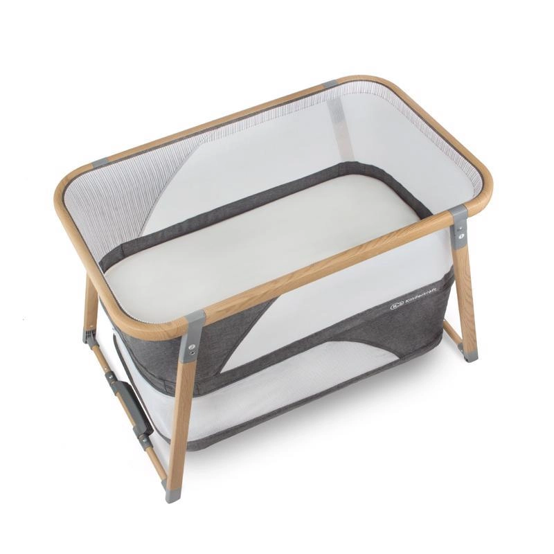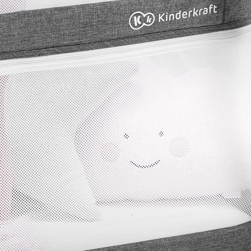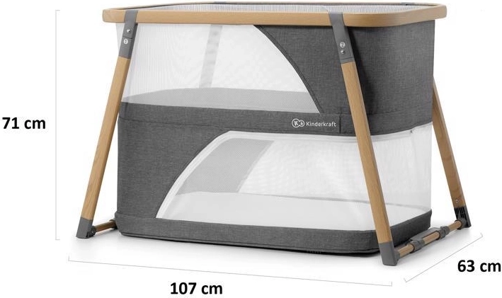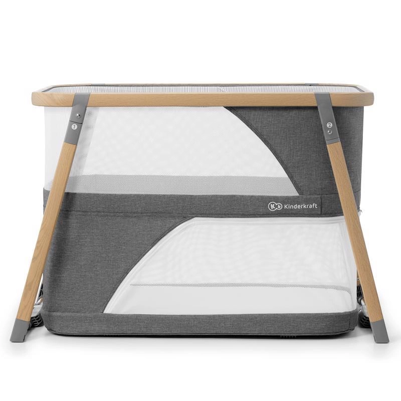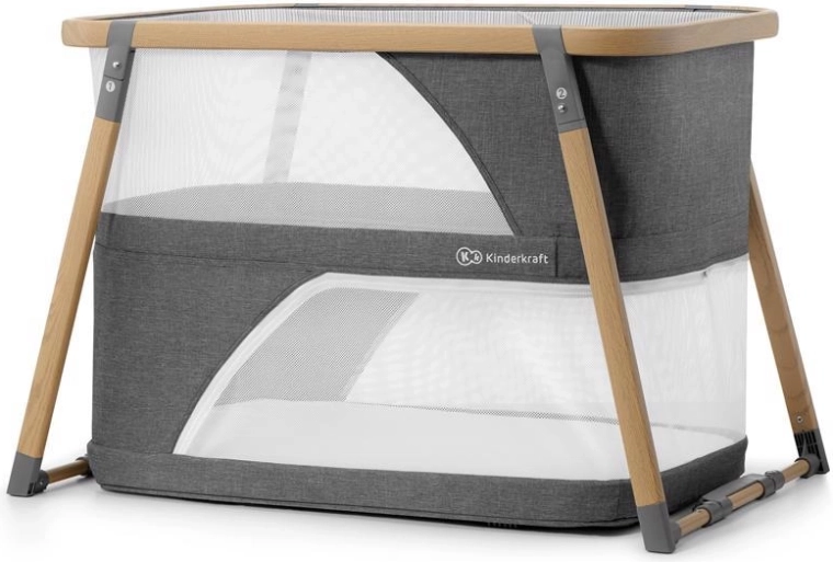 Multifunkcyjne łóżeczko 4w1 KINDERKRAFT Sofi w eleganckim szarym kolorze łączy w sobie łóżeczko, łóżeczko turystyczne, kojec oraz kołyskę. Oferuje szybkie składanie w 5 sekund, lekki aluminiowy stelaż w dekorze drewna, oddychające siatkowe boki oraz wysokiej jakości materac piankowy dla bezpiecznego i wygodnego snu oraz zabawy w domu i w podróży.