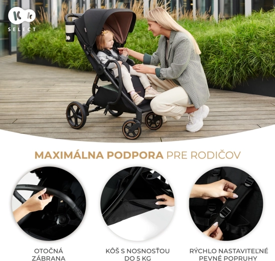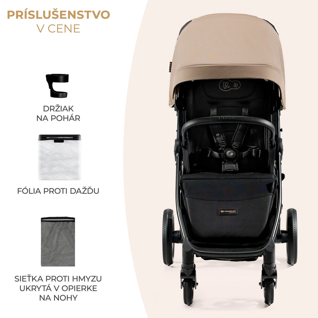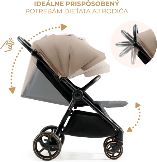 KINDERKRAFT Mitzy to lekki i praktyczny wózek spacerowy zaprojektowany do codziennych spacerów i podróży. Dzięki dużym, bezdętkowym kołom z pełną amortyzacją radzi sobie z kostką brukową, żwirem i krawężnikami, a płynna i cicha regulacja oparcia do pozycji leżącej oraz 3‑stopniowy podnóżek gwarantują wygodę od niemowlaka aż po przedszkolaka. Duża, wodoodporna budka z UPF50+ z panelem wentylacyjnym i okienkiem chroni przed słońcem, wiatrem i deszczem.