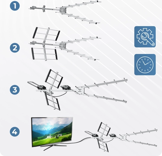 Montaż zajmuje zaledwie kilka minut: rozłóż antenę, wsuń reflektory, podłącz kabel koncentryczny i oglądaj TV. Bez narzędzi i bez stresu. Z anteną Berdsen zyskasz więcej programów bez abonamentu oraz ostry obraz w 4K Ultra HD.