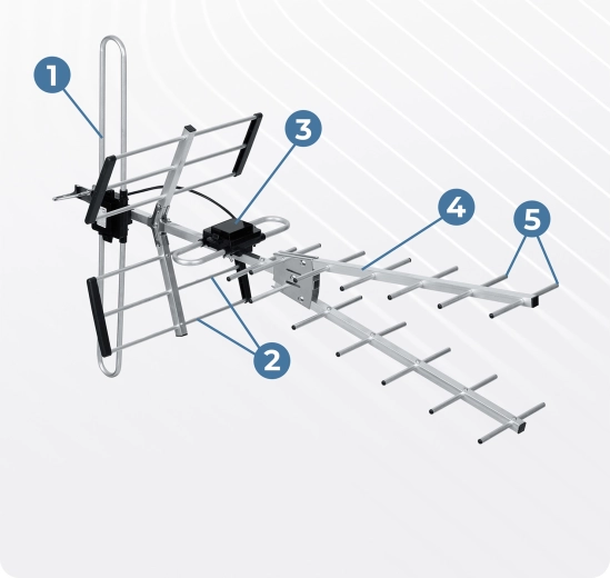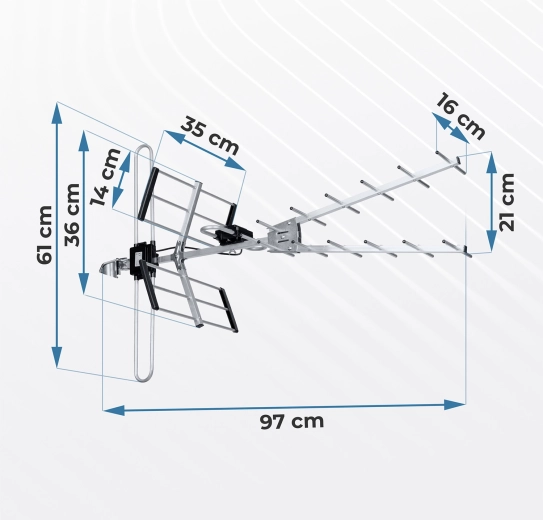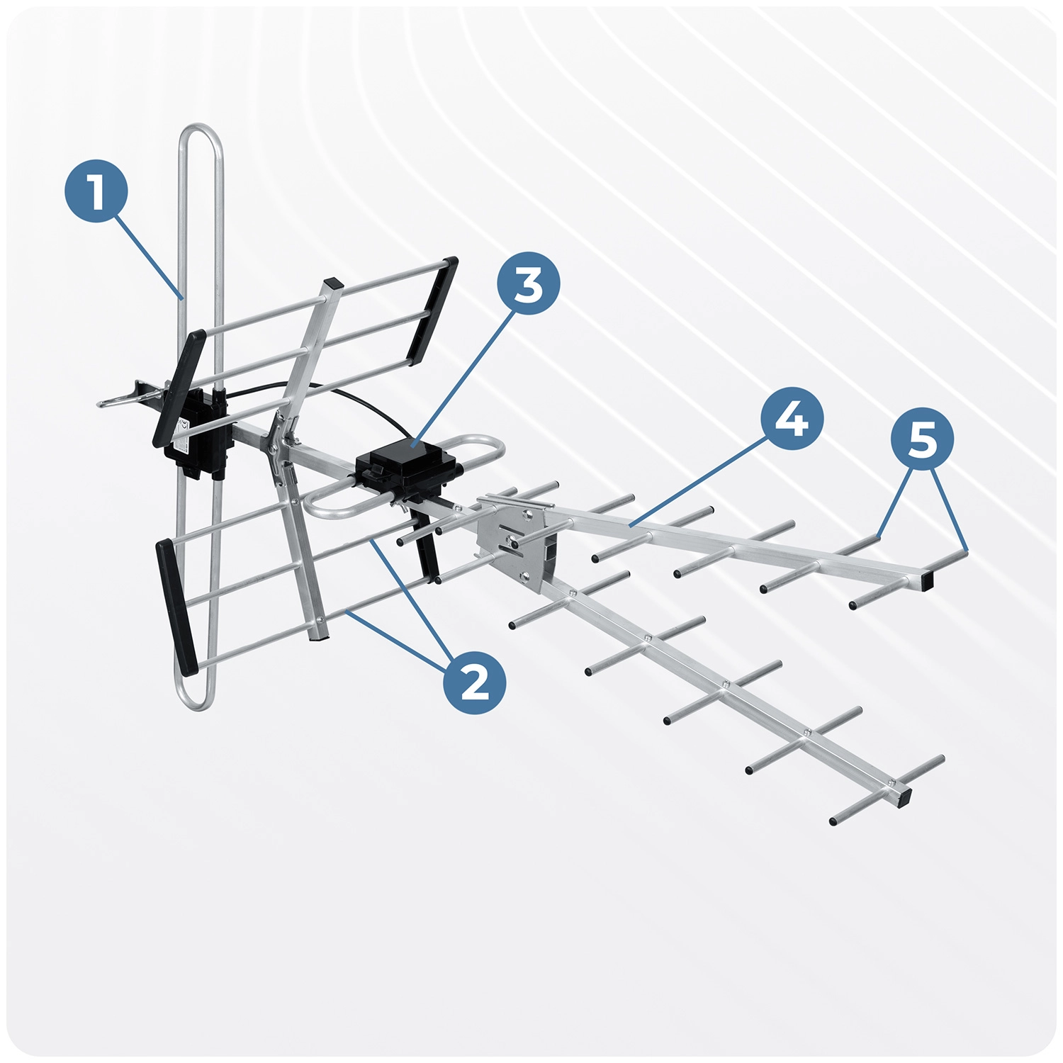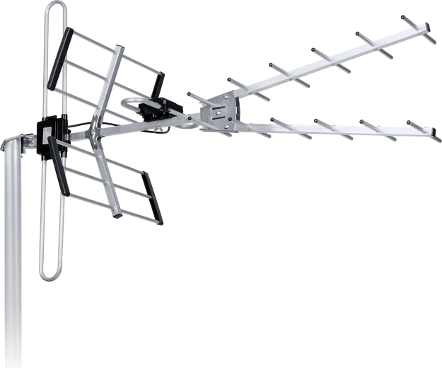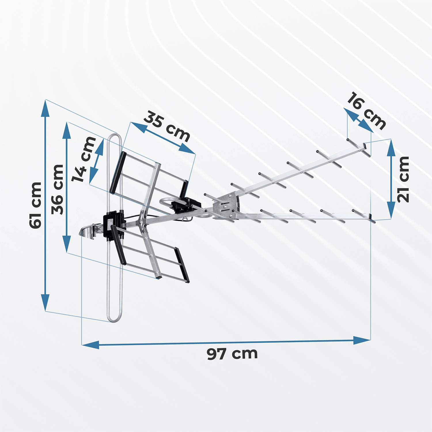 Antena Berdsen została zaprojektowana do pewnego odbioru nawet w bardziej wymagających warunkach. Dzięki kierunkowej konstrukcji Yagi z reflektorami i direktorami osiąga zysk do 16 dB oraz wysoką selektywność FBR ≥ 24 dB, co tłumi zakłócenia od tyłu i poprawia czystość sygnału. Wbudowany filtr LTE eliminuje wpływ sieci mobilnych 4G/5G, aby zapewnić czysty obraz i płynny dźwięk.