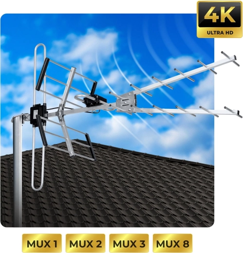 Obsługa pasm VHF + UHF gwarantuje pełne pokrycie wszystkich multipleksów (MUX 1–8). Obrotowy dipol VHF umożliwia łatwe dostosowanie do polaryzacji poziomej lub pionowej – wystarczy ustawić go względem nadajnika. Dzięki zasięgowi do 80 km idealnie sprawdzi się w mieście i na wsi, pomagając w odbiorze z bardziej oddalonych nadajników.
