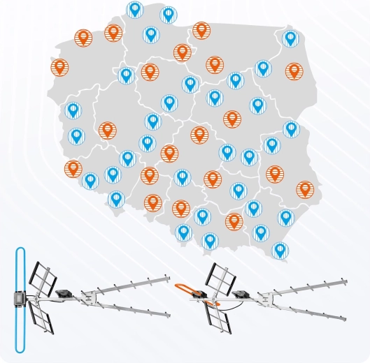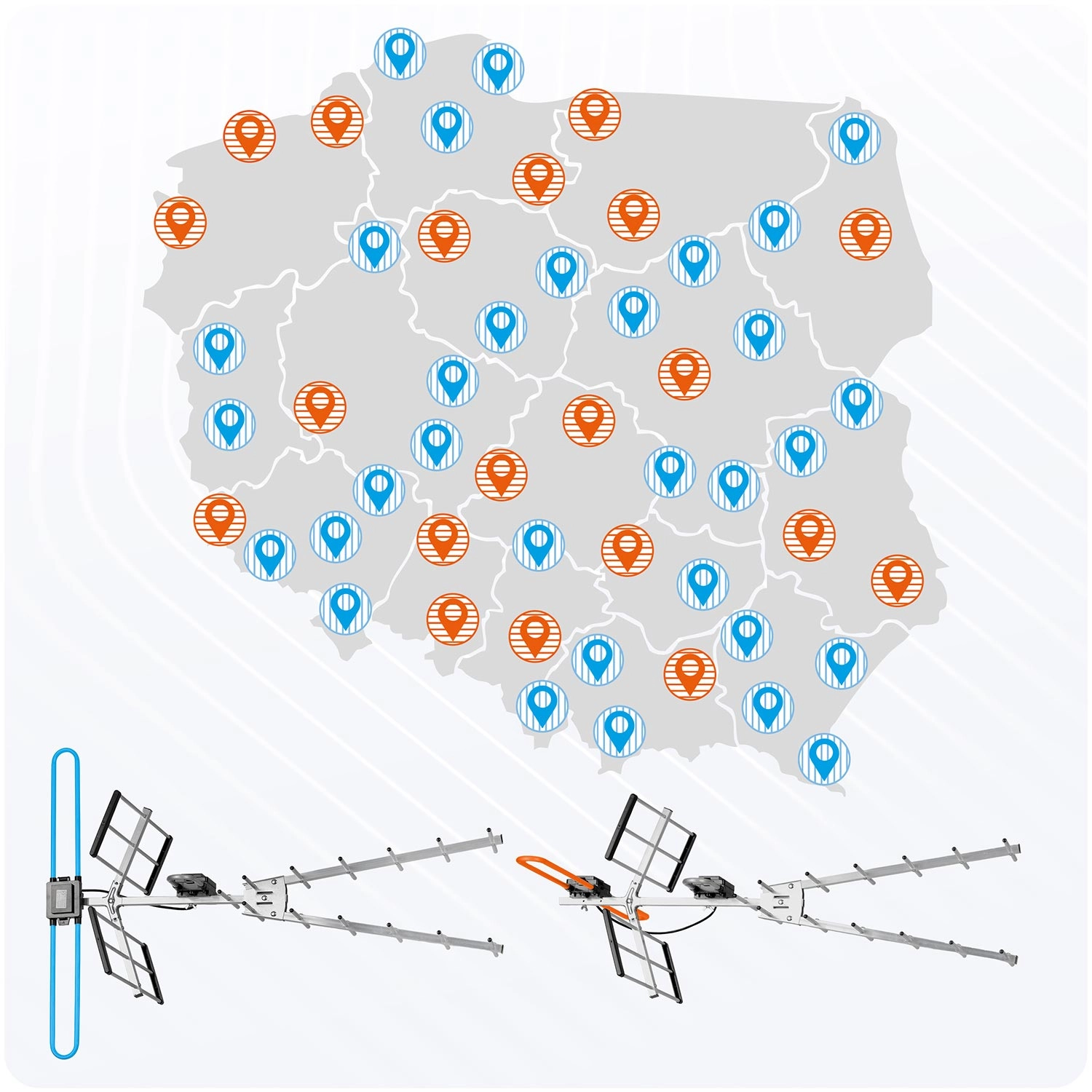 • VHF + UHF, MUX 1–8 – pełne pokrycie telewizji naziemnej.