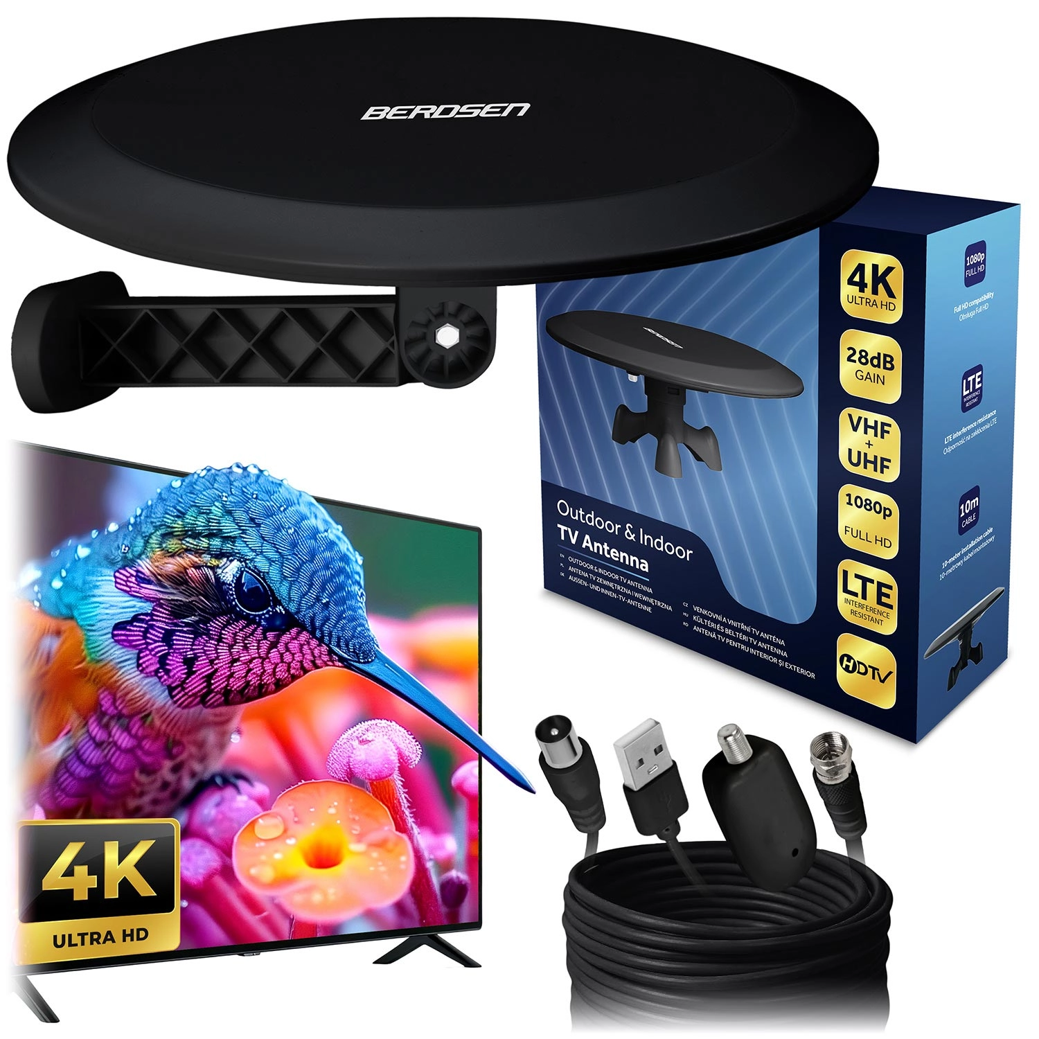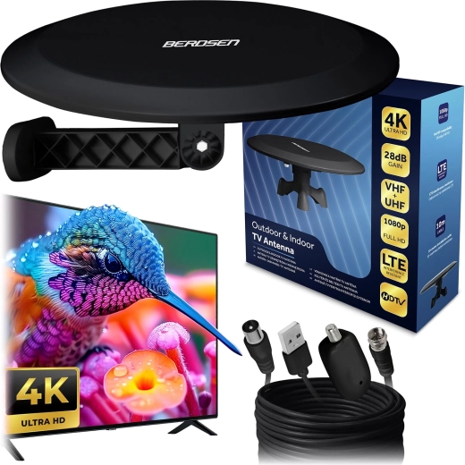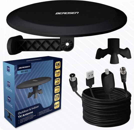 Aktywna antena TV BERDSEN BD-955 to idealne rozwiązanie do miasta i na wieś. Oferuje wysokie wzmocnienie 28 dB, odbiór pasm VHF i UHF, w tym wszystkich multipleksów (MUX 1–8), oraz kompatybilność ze standardami DVB-T i DVB-T2. Dzięki możliwości montażu wewnątrz i na zewnątrz oraz 10‑metrowemu kablowi łatwo znajdziesz optymalne miejsce z najsilniejszym sygnałem.