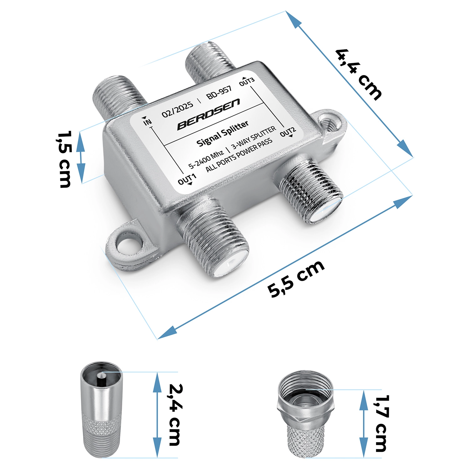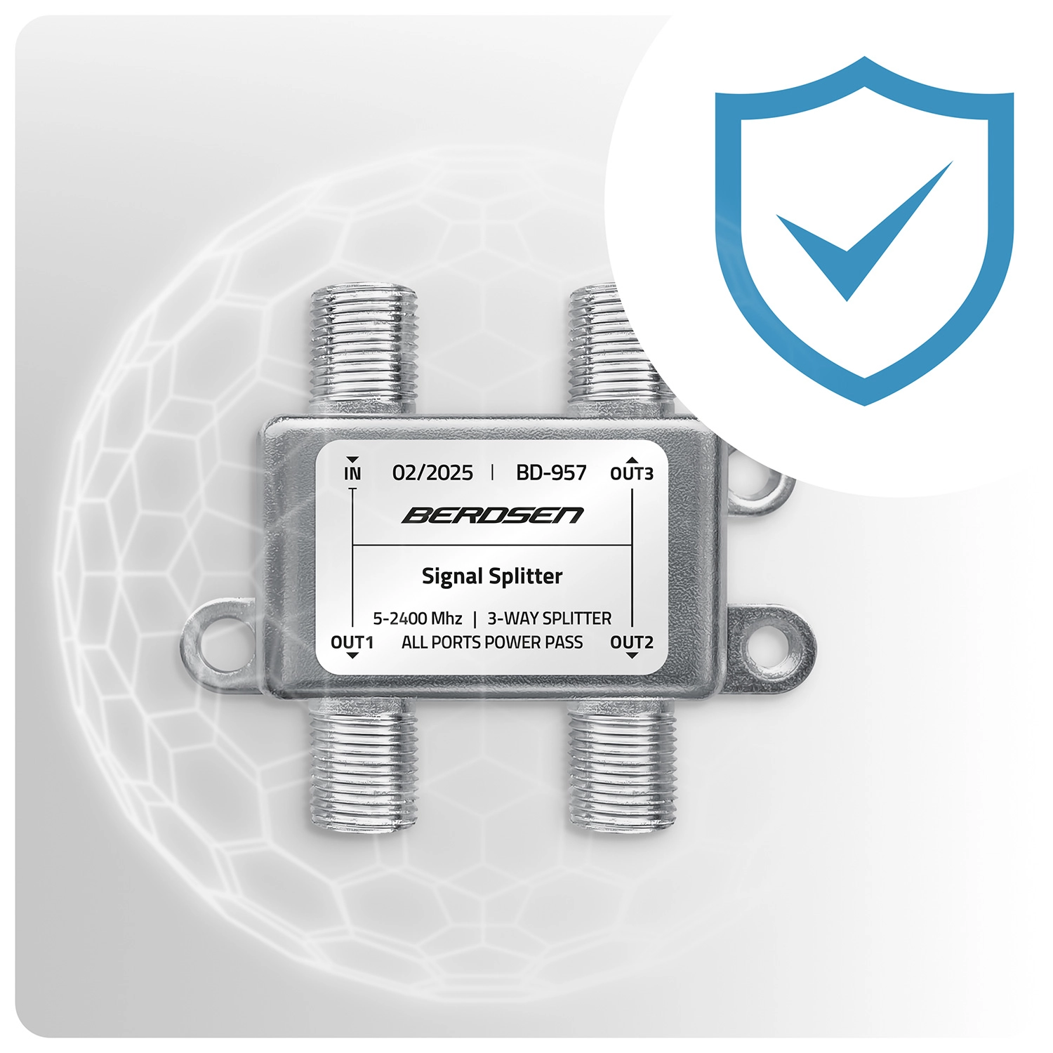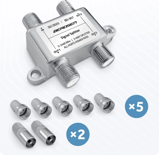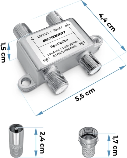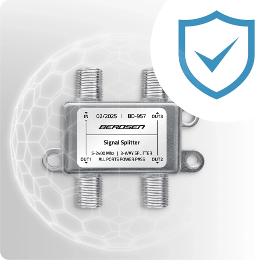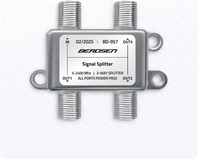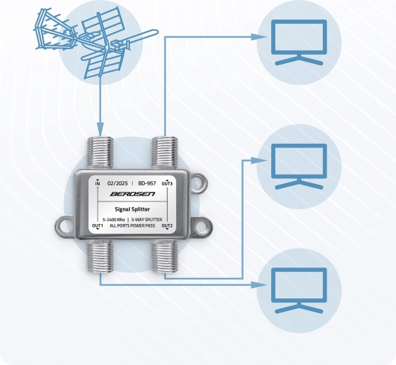 Jedna antena – trzy niezależne odbiorniki. Ten 3‑drożny pasywny rozdzielacz antenowy skutecznie dzieli sygnał z anteny, satelity lub telewizji kablowej na trzy wyjścia bez potrzeby dodatkowych urządzeń. Dzięki funkcji All Ports Power Pass łatwo zasilisz wzmacniacz antenowy lub LNB bezpośrednio po kablu koncentrycznym.