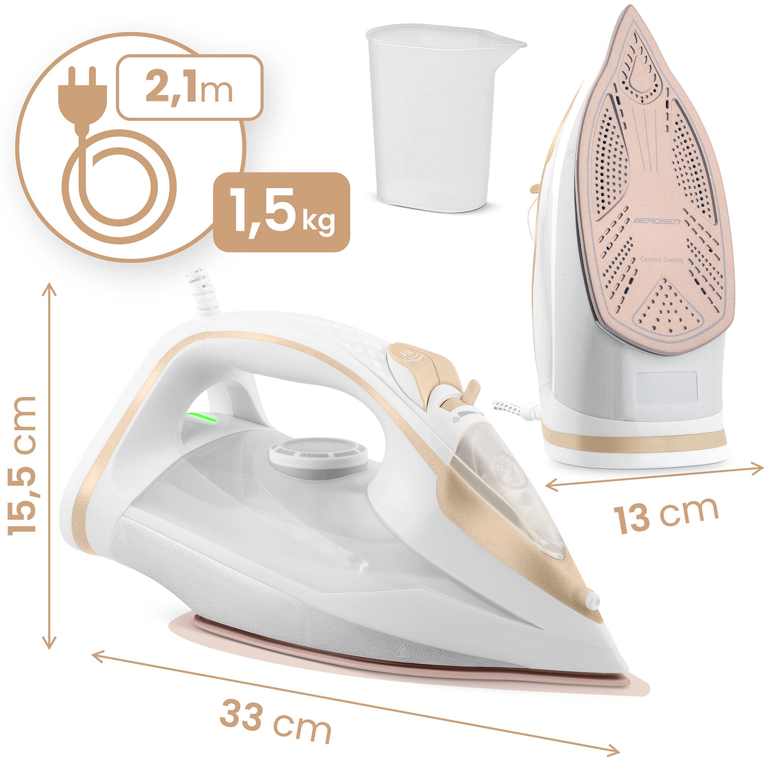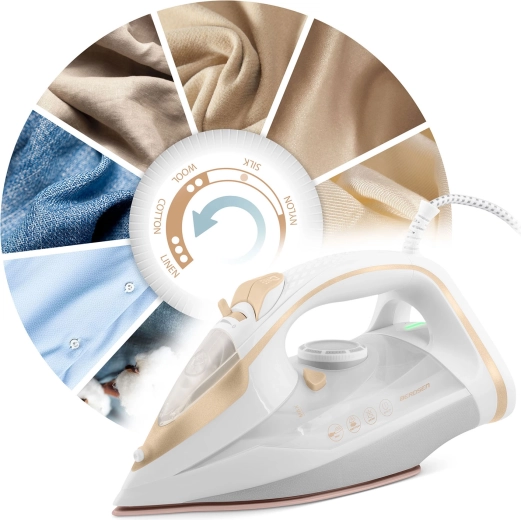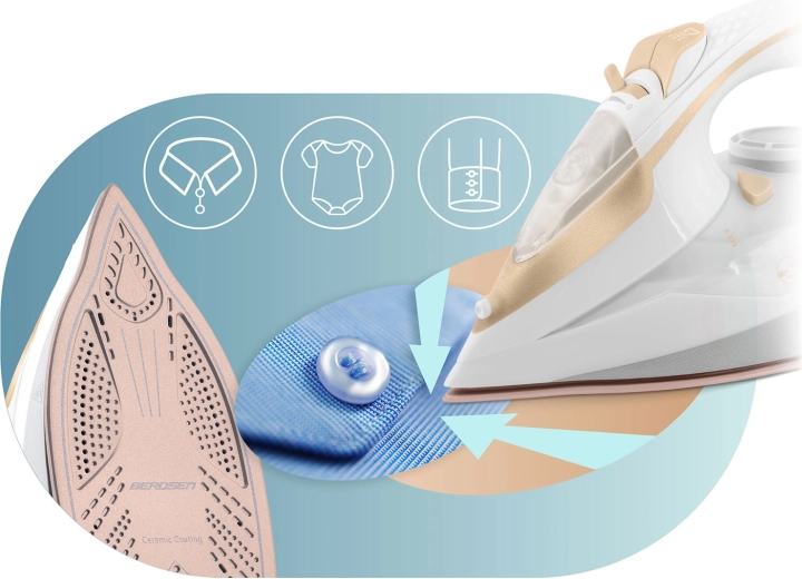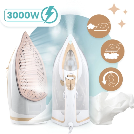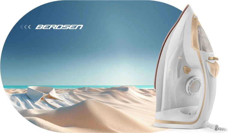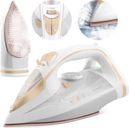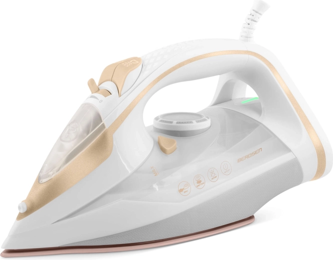 Wydajne żelazko parowe Berdsen o mocy 3000 W zapewnia szybkie i precyzyjne prasowanie wszystkich rodzajów tkanin. Oferuje ceramiczną stopę z mikrokanalikami dla równomiernej dystrybucji pary, pionowe parowanie, płynną regulację temperatury i pary, automatyczne wyłączanie oraz praktyczną funkcję Self Clean dla łatwej konserwacji. Duży zbiornik na wodę 350 ml i obrotowy przewód 360° zwiększają komfort użytkowania.