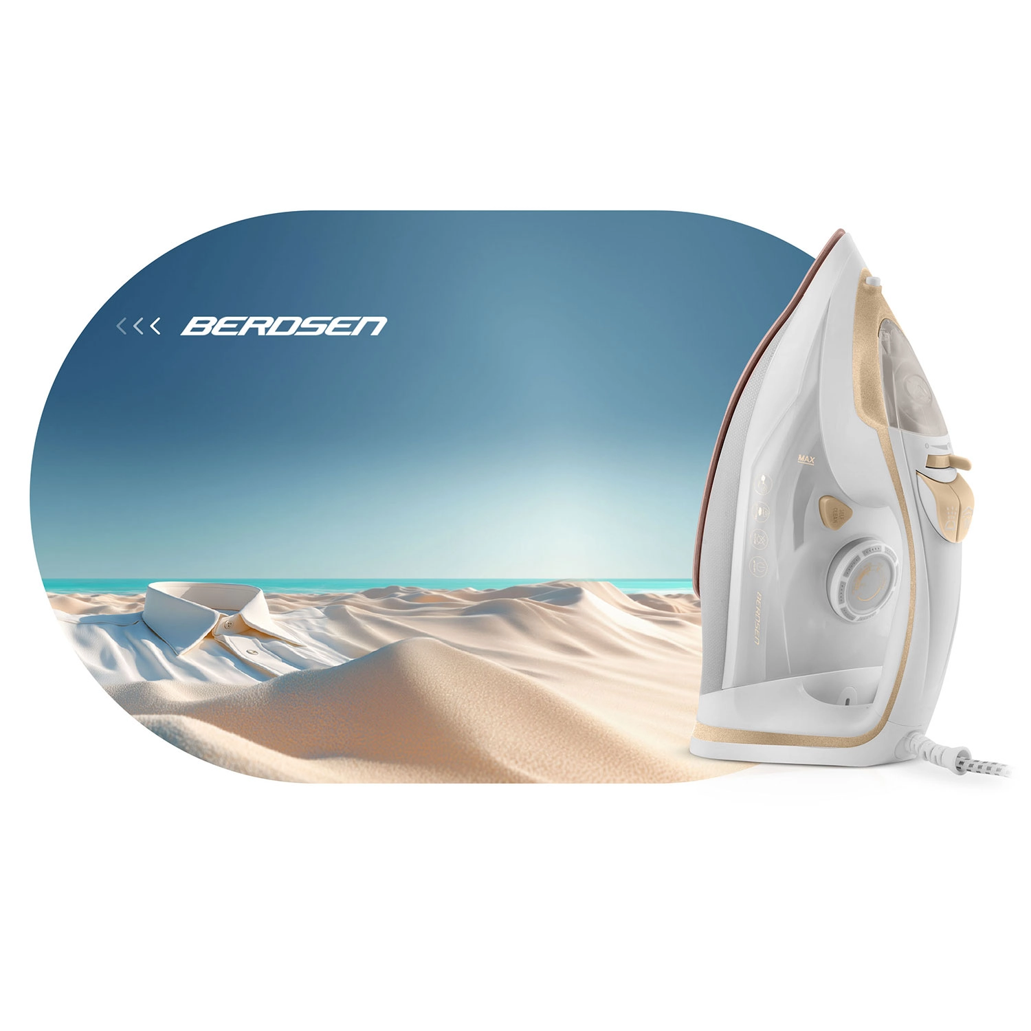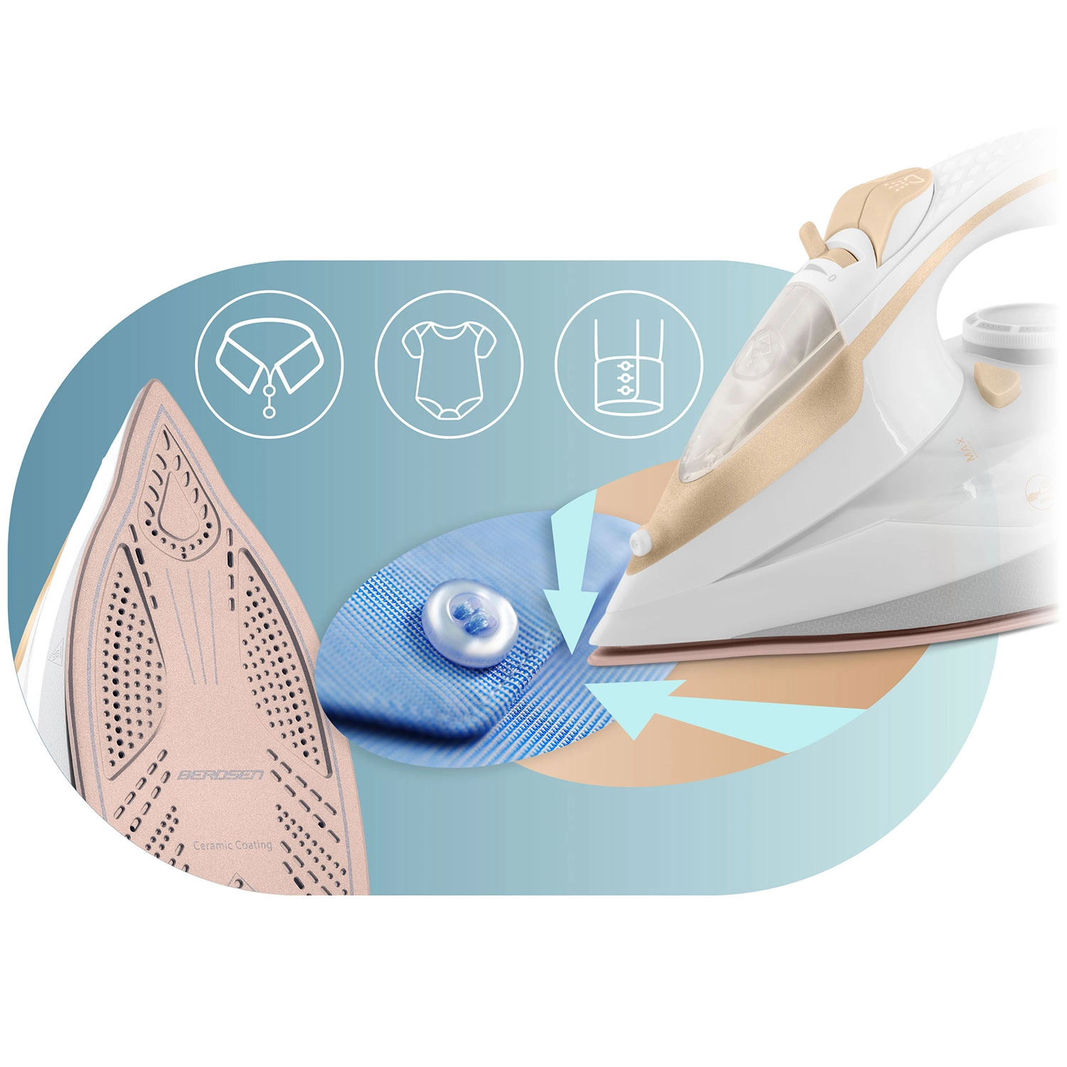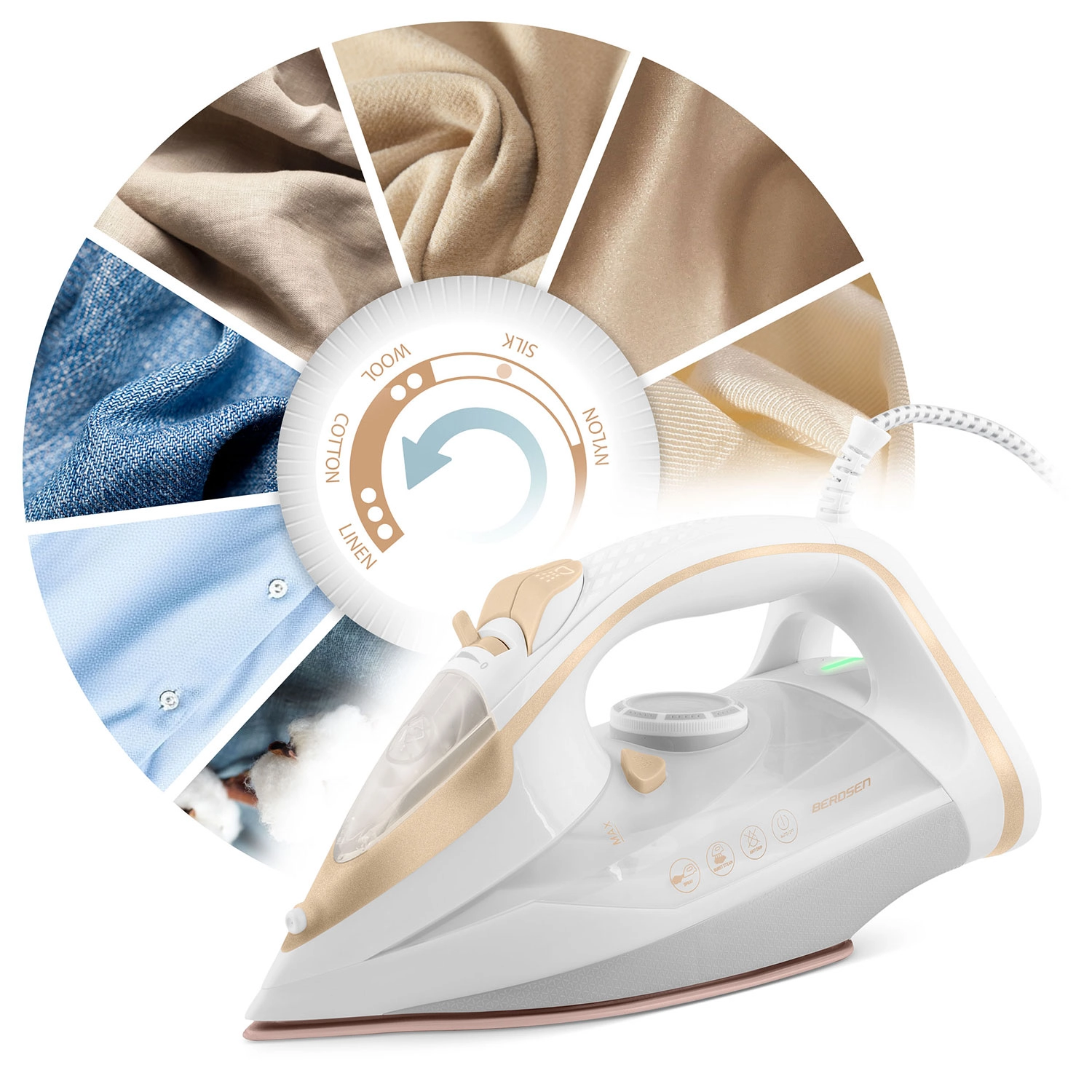 Wydajne żelazko parowe Berdsen o mocy 3000 W zapewnia szybkie i precyzyjne prasowanie wszystkich rodzajów tkanin. Oferuje ceramiczną stopę z mikrokanalikami dla równomiernej dystrybucji pary, pionowe parowanie, płynną regulację temperatury i pary, automatyczne wyłączanie oraz praktyczną funkcję Self Clean dla łatwej konserwacji. Duży zbiornik na wodę 350 ml i obrotowy przewód 360° zwiększają komfort użytkowania.