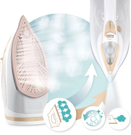 Szybkie i delikatne prasowanie bez kompromisów. Ceramiczna stopa z mikrokanalikami gwarantuje świetny poślizg i równomierne rozprowadzanie pary, dzięki czemu łatwo poradzisz sobie z koszulami, lnem czy pościelą. Dzięki pionowemu parowaniu wygładzisz również zasłony lub ubrania na wieszaku bez potrzeby użycia deski do prasowania. Funkcja Self Clean wydłuża żywotność urządzenia i utrzymuje je w doskonałej kondycji.