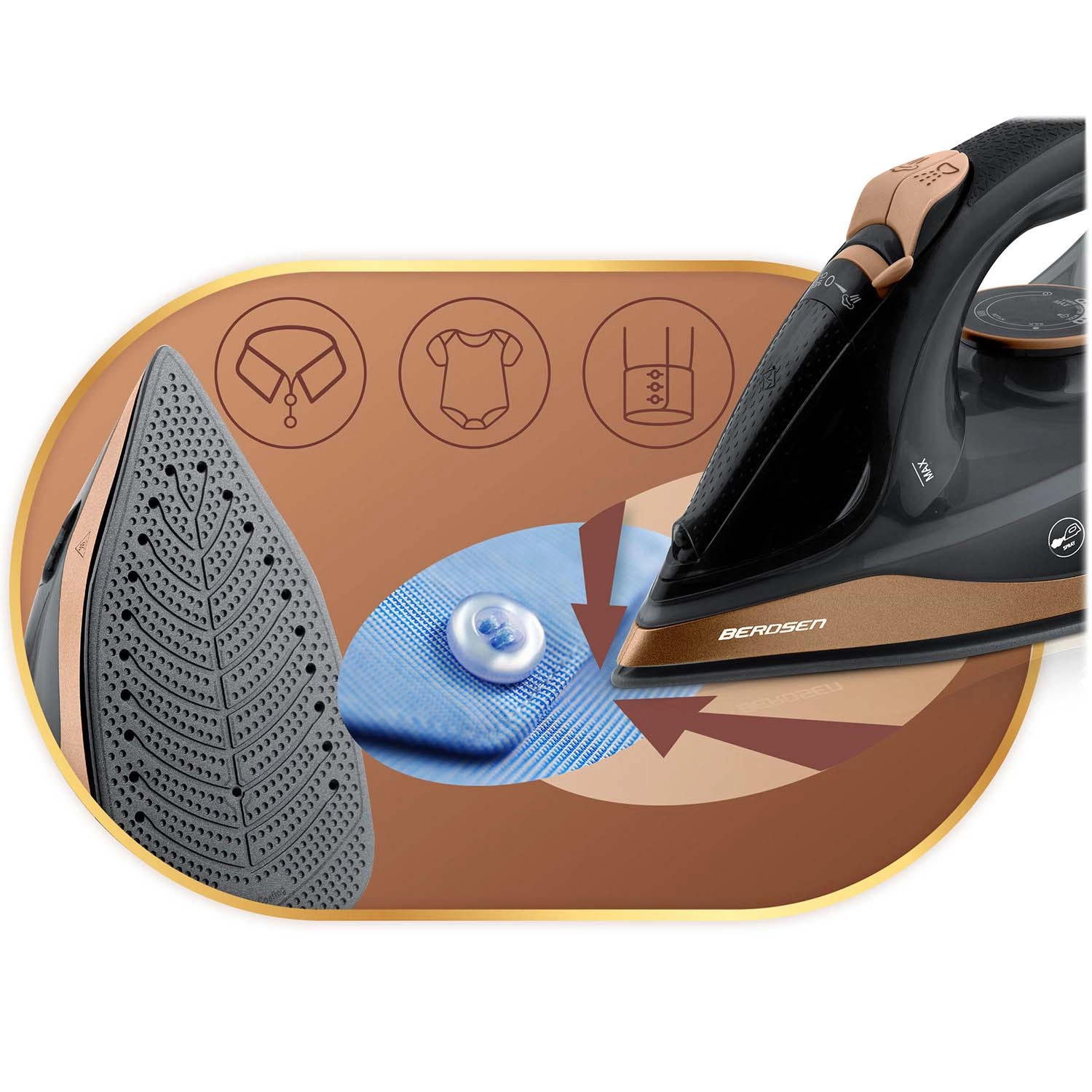 Żelazko Berdsen łączy moc 2600 W i gładką ceramiczną stopę z mikrokanalikami dla równomiernej dystrybucji pary. Dzięki prasowaniu pionowemu wygładzisz zasłony czy ubrania na wieszaku bez konieczności użycia deski do prasowania. Zbiornik na wodę o pojemności 320 ml i praktyczny spryskiwacz umożliwiają celowane zwilżanie nawet najbardziej uporczywych zagnieceń.