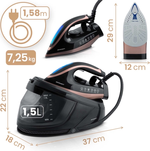 - Wyjmowany zbiornik 1,5 l do długiego prasowania bez przerw