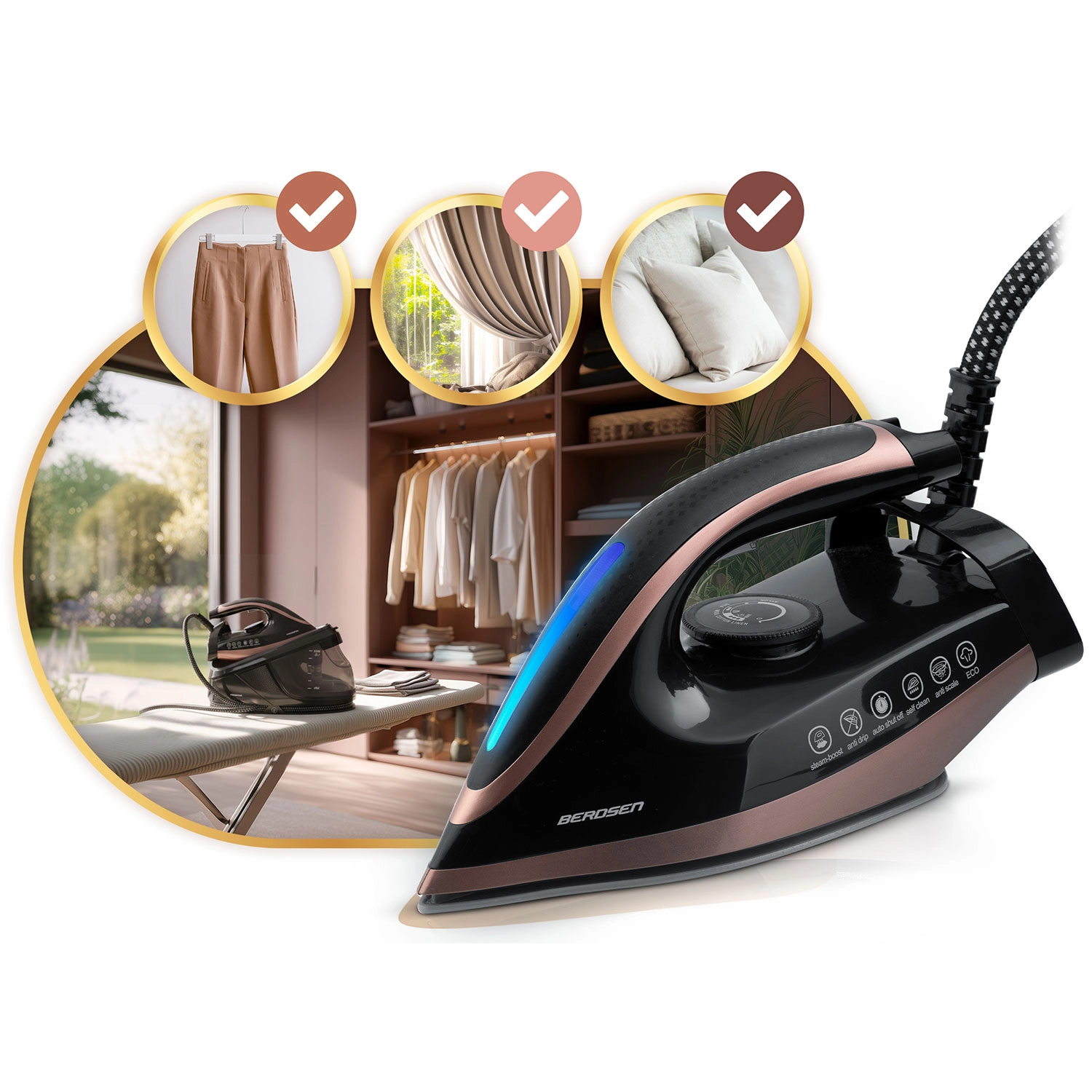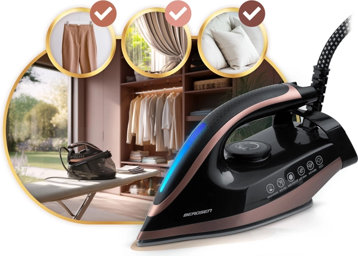 Generator pary BERDSEN to idealny wybór dla domów, które chcą połączyć wysoką wydajność, wygodę i delikatność dla tkanin. Ceramiczna stopa z doskonałym poślizgiem i mikrokanałami równomiernie rozprowadza parę, dzięki czemu usuniesz nawet trudne zagniecenia na koszulach, lnie, pościeli czy zasłonach. Dzięki dużemu zbiornikowi 1,5 l poradzisz sobie z długim prasowaniem bez częstego dolewania wody.