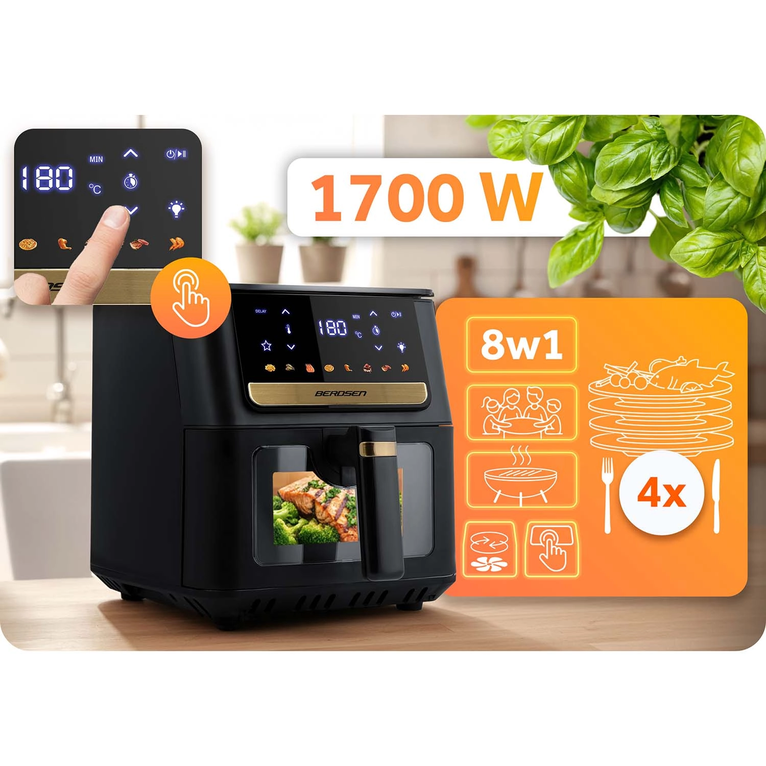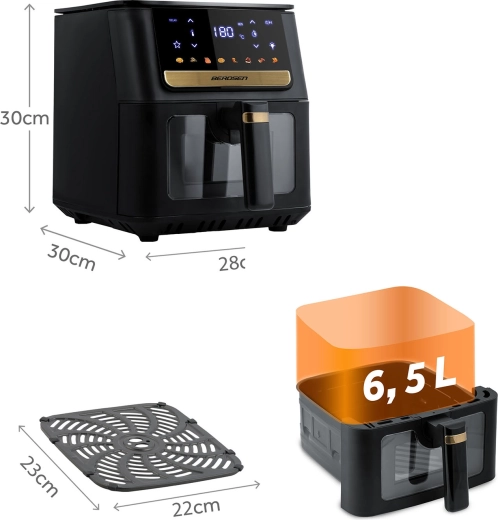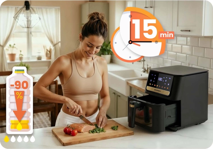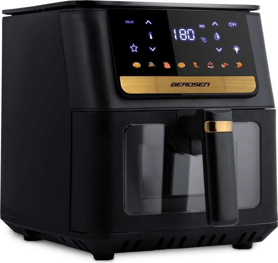 Frytkownica beztłuszczowa BERDSEN zapewnia szybką i równomierną obróbkę ulubionych dań bez zbędnego oleju. Duży kosz 6,5 l mieści porcje dla całej rodziny – od frytek, skrzydełek i steków po całego kurczaka. Podświetlenie LED i przezroczyste okienko pozwalają kontrolować proces bez przerywania pieczenia, a wyświetlacz dotykowy oferuje czytelne ikony i gotowe ustawienia dla łatwego wyboru programu.