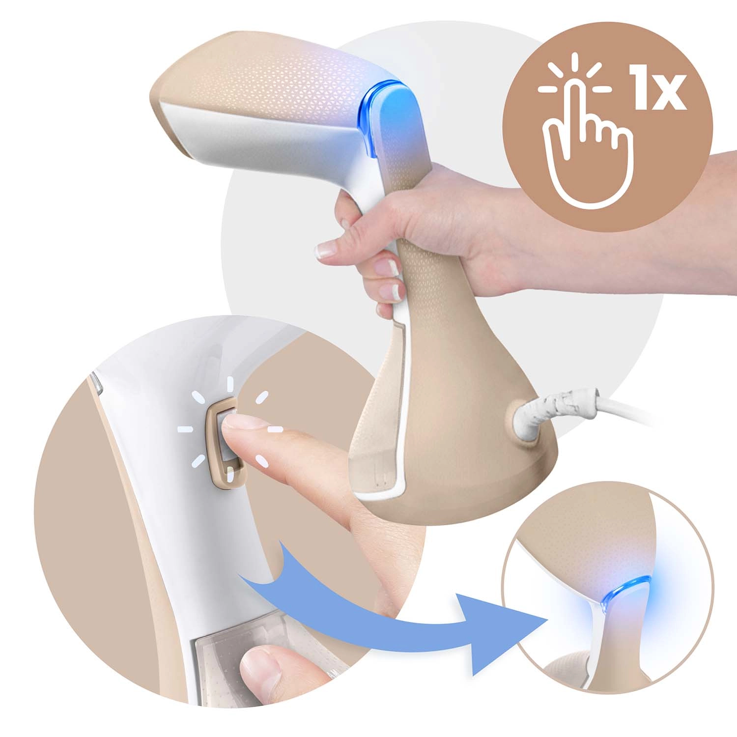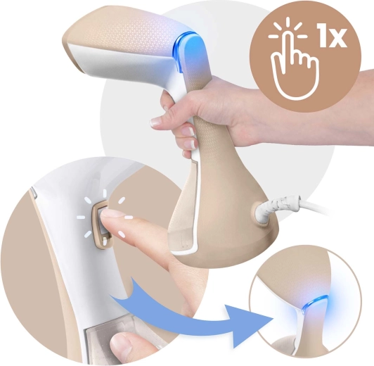 Silny strumień pary szybko wygładza nawet uporczywe zagniecenia na koszulach, spodniach i sukienkach – prosto na wieszaku, bez deski do prasowania.