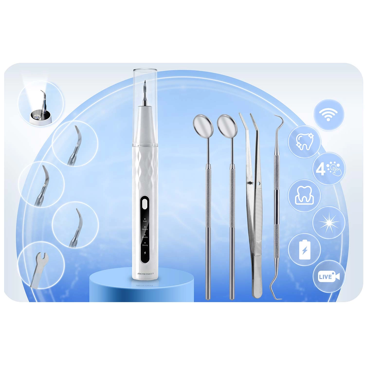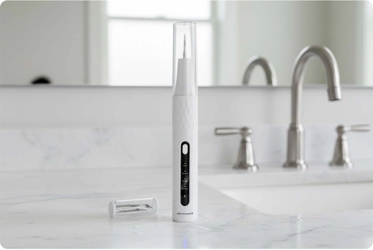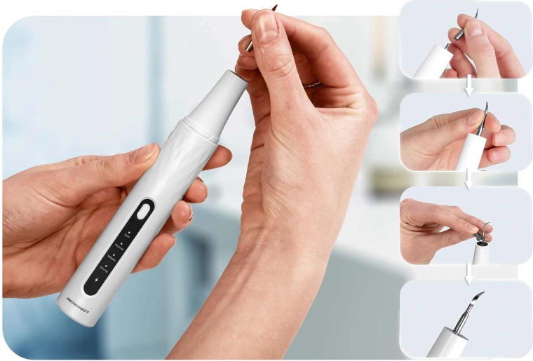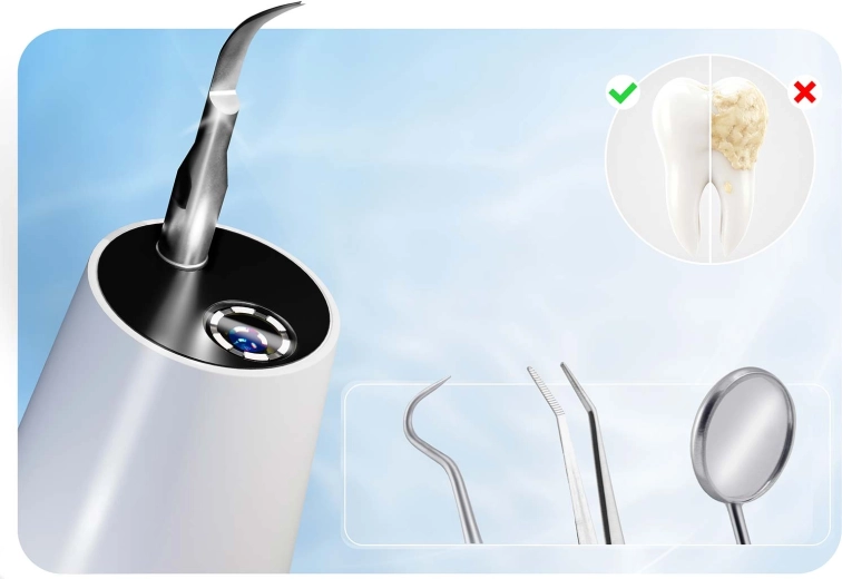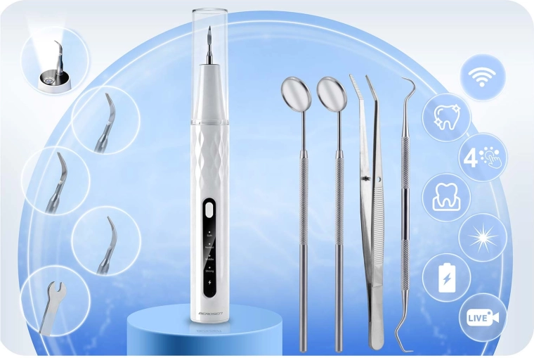 Domowa pielęgnacja zębów na profesjonalnym poziomie. Skaler ultradźwiękowy BERDSEN zintegrowany z kamerą 2 Mpx i oświetleniem LED pozwala precyzyjnie zobaczyć miejsca z kamieniem nazębnym i osadem. Oferuje 4 tryby pracy (35–45 kHz) dla różnych wrażliwości, automatyczne zatrzymanie przy kontakcie z tkanką miękką, wodoodporność IPX7, długą żywotność baterii z ładowaniem USB‑C oraz bogaty zestaw akcesoriów, w tym 4 wymienne końcówki i zestaw stalowych narzędzi dentystycznych. Idealny do bezpiecznego i skutecznego czyszczenia w domowym zaciszu.