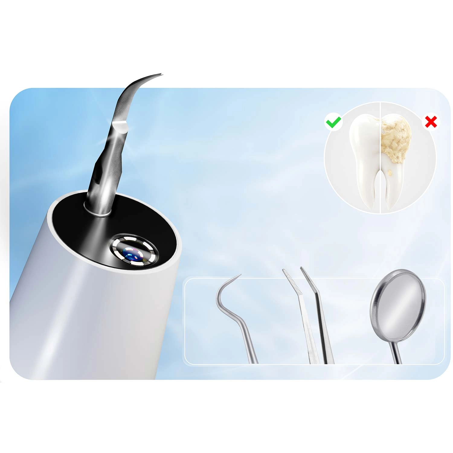 - Zestaw narzędzi dentystycznych ze stali nierdzewnej: 2× lusterko, skrobak, pęseta – idealne dla początkujących oraz do precyzyjnego doczyszczania przestrzeni międzyzębowych.