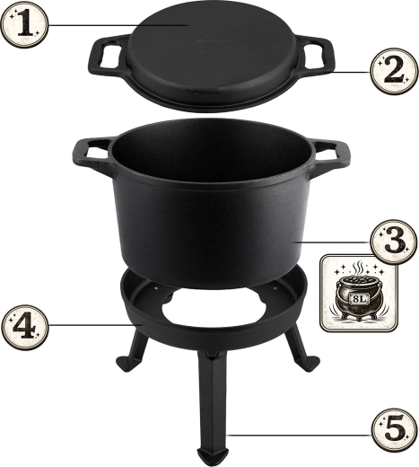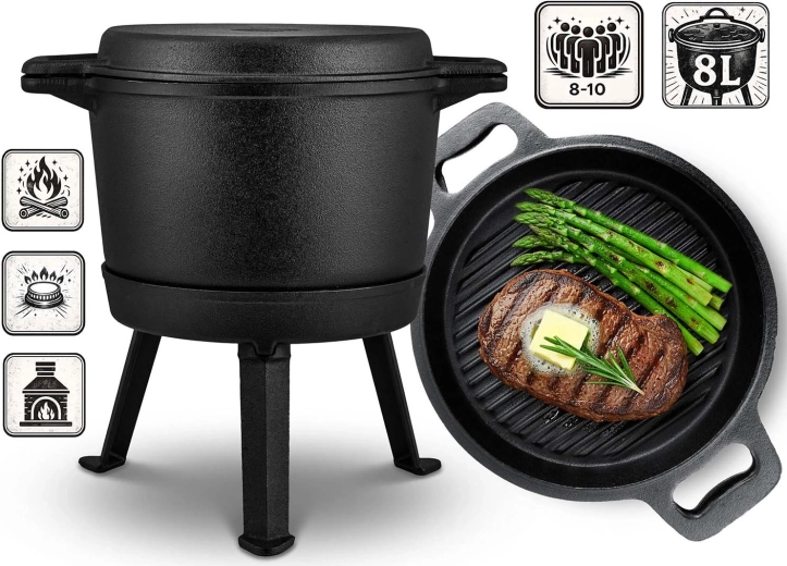Odkryj urok tradycyjnego gotowania nad rozżarzonymi węglami. Ten 8‑litrowy żeliwny kociołek poradzi sobie z powolnym duszeniem, pieczeniem i smażeniem – a to dzięki dwustronnej pokrywie, która służy jako patelnia grillowa. Żeliwo utrzymuje stabilną temperaturę, potrawy się nie przypalają, a smaki pięknie się łączą.
