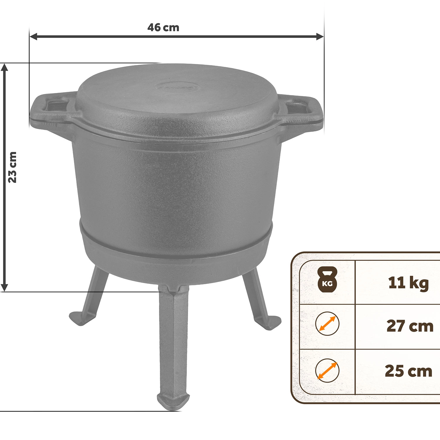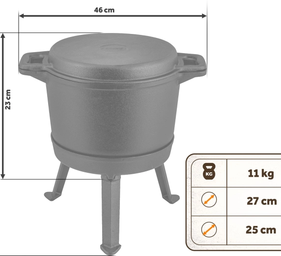 Stabilny trójnożny stojak z prostym mocowaniem na trzy śruby zapewnia bezpieczne ustawienie nad ogniem. Wygodne boczne uchwyty umożliwiają łatwe przenoszenie. Kociołek nadaje się na ognisko, paleniska, kuchenki gazowe i grill, więc wykorzystasz go w ogrodzie, na działce i podczas biwaków.