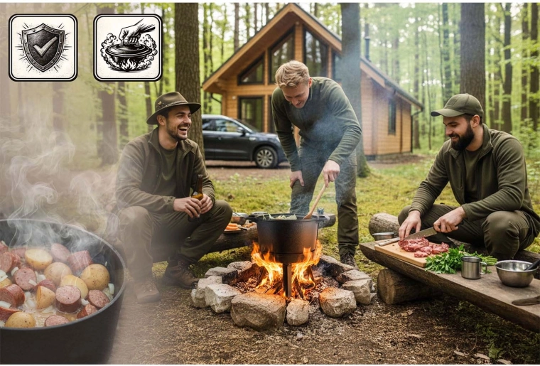 Solidny stojak z prostym mocowaniem na trzy śruby pewnie utrzymuje kociołek nawet na nierównej powierzchni. Gotujesz bezpiecznie bezpośrednio nad żarem.