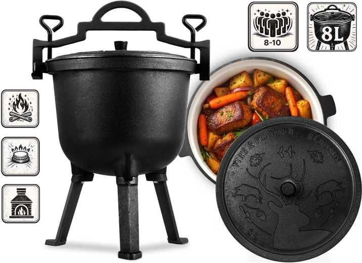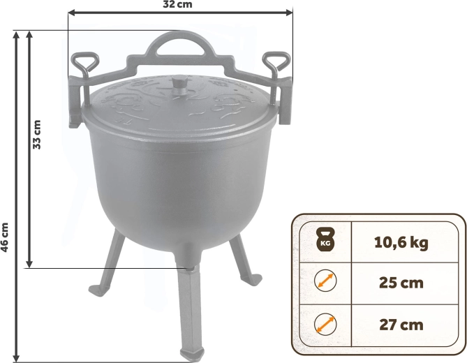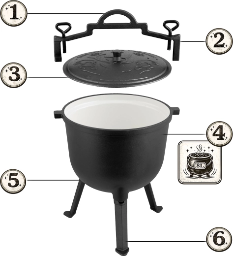 Dzięki uniwersalnej konstrukcji postawisz go na stabilnym trójnogu, zawiesisz nad ogniskiem za mocny uchwyt lub po odkręceniu nóżek użyjesz na kuchence gazowej. Wewnętrzna emalia ułatwia czyszczenie i chroni składniki przed bezpośrednim kontaktem z żeliwem. Ciężka pokrywa z otworem odpowietrzającym zatrzymuje parę i aromat wewnątrz dla soczystego efektu.