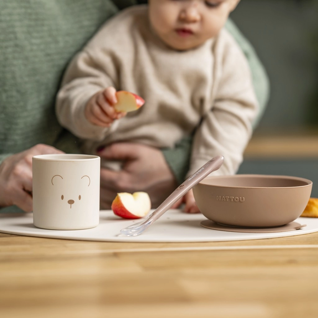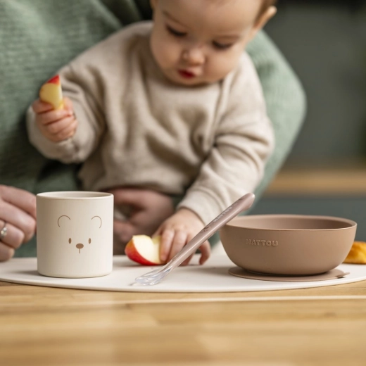 Ten silikonowy zestaw do posiłków Nattou został zaprojektowany tak, aby wspierać pierwsze kroki dziecka w samodzielnym jedzeniu. Miękki i wytrzymały silikon jest przyjemny w dotyku, bezpieczny dla dziecięcych dziąseł, a jednocześnie wytrzymuje codzienne użytkowanie bez pękania czy tłuczenia. Neutralny odcień natural łatwo dopasowuje się do nowoczesnych wnętrz.