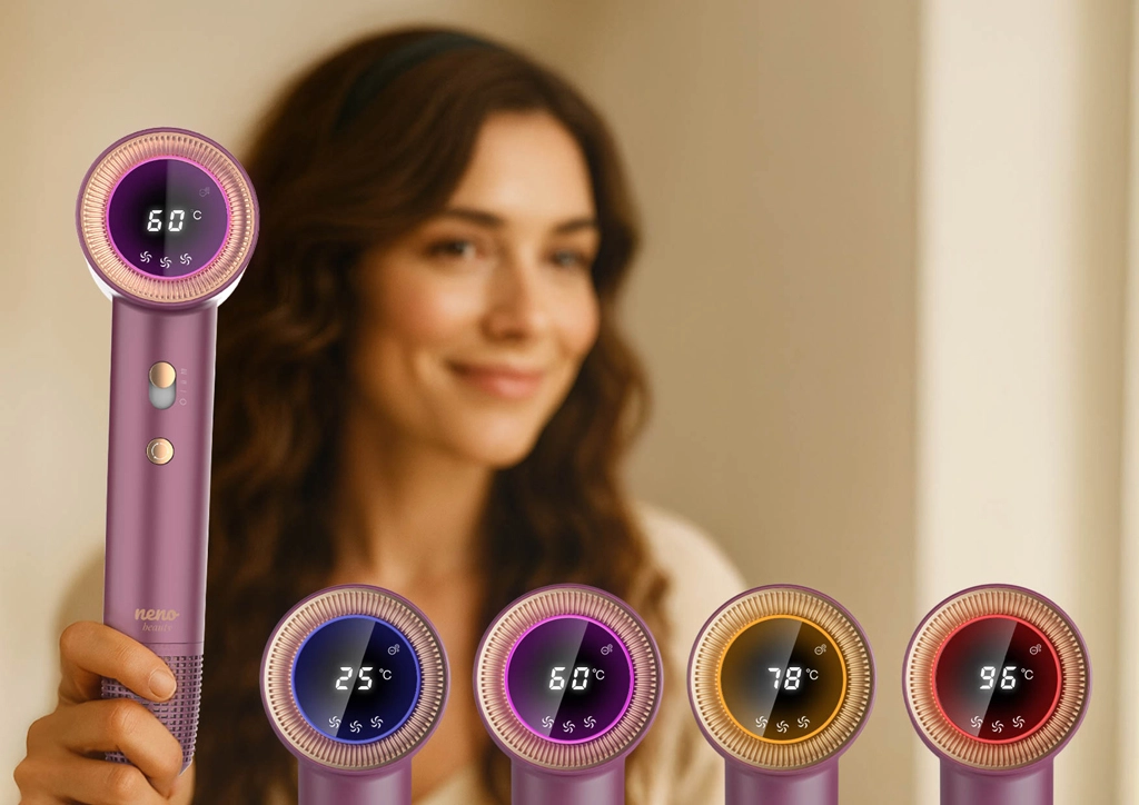 Czujnik monitoruje temperaturę nawet 100× na sekundę i chroni włosy przed przegrzaniem. Wyświetlacz LED z kolorowym pierścieniem czytelnie pokazuje ustawienia temperatury i prędkości.