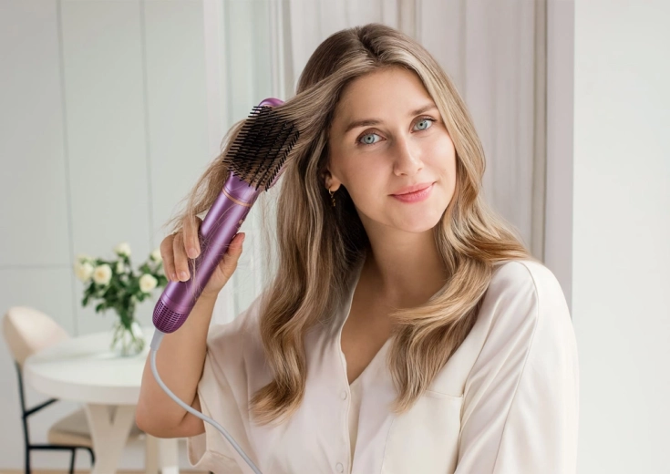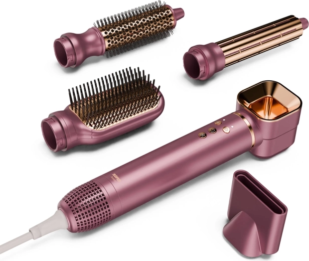 Wymienne nasadki obejmują pełną rutynę – od szybkiego suszenia przez wygładzanie i zwiększanie objętości po naturalne fale i loki. Jedno urządzenie, pięć możliwości.