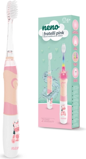 Neno Fratelli zmienia rutynowe mycie zębów w wesołą przygodę. Kolorowe diody LED z pulsującym efektem motywują dzieci, a 2‑minutowy timer z pauzami co 30 sekund prowadzi do prawidłowego podziału czyszczenia. Miękkie nylonowe włókna są delikatne dla wrażliwych dziecięcych dziąseł, a dzięki temu, że nie chłoną wody, pozostają higieniczne i odporne na deformacje.
