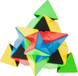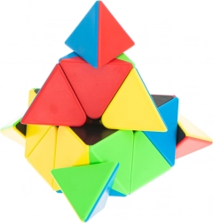 Ten łamigłówka jest wykonana z kolorowych plastikowych elementów, które łączą się, tworząc atrakcyjny kształt geometryczny.