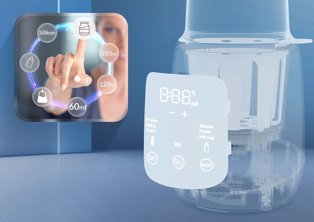 Inteligentny tryb Smart Pro automatycznie dobiera optymalny czas i temperaturę w zależności od typu naczynia (plastik, silikon, woreczek na mleko), jego pojemności oraz temperatury początkowej. Obsługa jest maksymalnie przejrzysta dzięki ikonom dotykowym i czytelnemu wyświetlaczowi. Wbudowana lampka LED ułatwia nocną obsługę bez włączania głównego światła, a szybki tryb zapewnia ciepłą wodę do mleka modyfikowanego lub gotowy posiłek w mgnieniu oka.