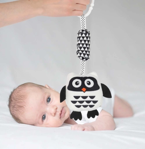 Ta kontrastowa zawieszana zabawka w kształcie sowy została zaprojektowana z myślą o potrzebach noworodków. Wysoki kontrast czerni i bieli przyciąga wzrok dziecka i wspiera wczesny rozwój widzenia. Miękkie, przyjemne w dotyku materiały oraz bezpieczne wykonanie gwarantują komfortowe i bezpieczne odkrywanie.