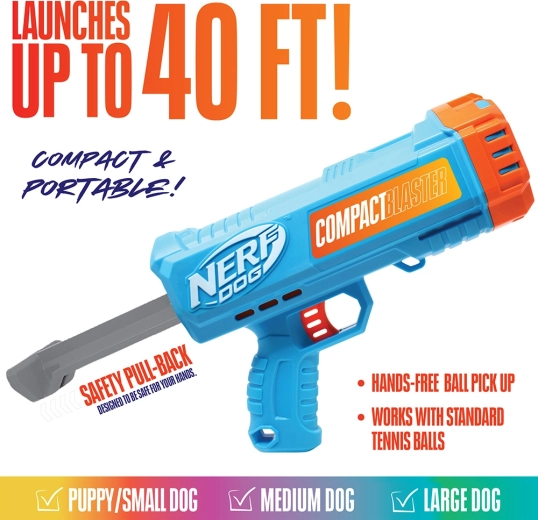 Przygotuj się, wyceluj i aportuj z blasterem NERF DOG, który wystrzeliwuje piłki aż do 12 metrów, zapewniając Twojemu psu świetny trening bez wysiłku dla Twojej ręki. Dzięki kompaktowym wymiarom jest łatwy w użyciu, przenoszeniu i przechowywaniu, a także umożliwia higieniczne podnoszenie piłek bez użycia rąk. W zestawie znajdują się 2 wytrzymałe piłki tenisowe w standardowym rozmiarze 2,5".
