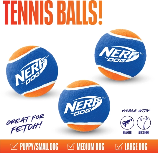 Zestaw trzech piłek NERF DOG jest idealny do codziennej zabawy „rzuć i aportuj”. Zamykana ciśnieniowa tuba pomaga utrzymać optymalne ciśnienie, sprężystość i odskok piłek, dzięki czemu Twój pies cieszy się stałą jakością przy każdym rzucie. Wariant bez piszczałki oferuje cichszą zabawę – w sam raz dla wrażliwych psów i opiekunów preferujących spokojniejszą aktywność.