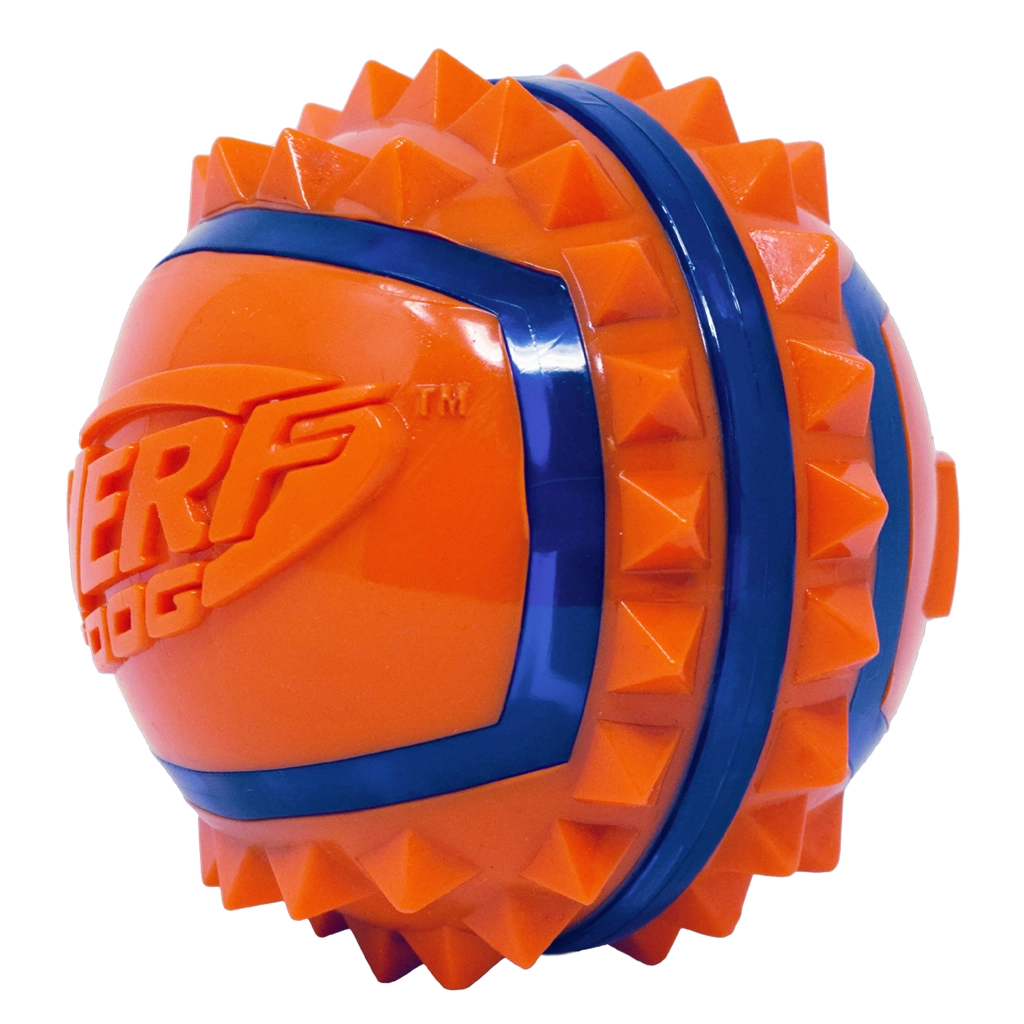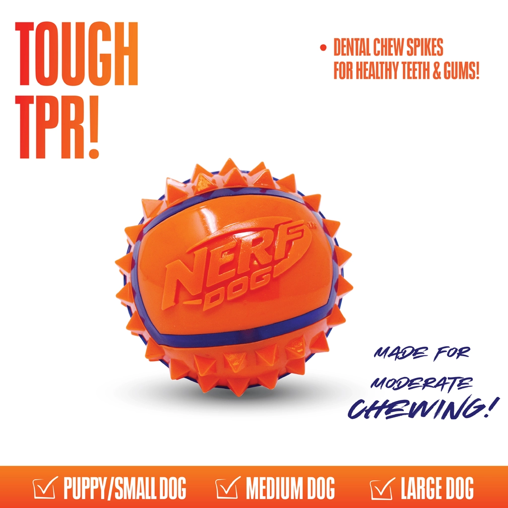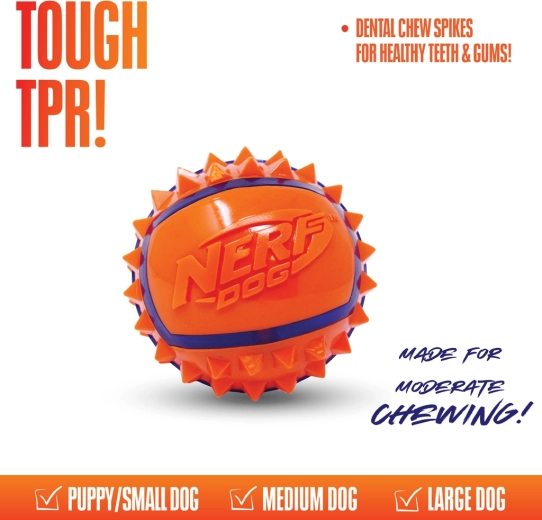 Nerf Dog kolczasta piłka dla psów 9 cm przynosi psom radość z ruchu, a opiekunom wygodne rzucanie i noszenie. Wysokiej jakości termoplastyczna guma (TPR) łączy wytrzymałość, elastyczność i odporność, dzięki czemu nadaje się do regularnego użytkowania. Dzięki kontrastowym kolorom piłka jest łatwo widoczna także podczas szybkiej zabawy na zewnątrz.