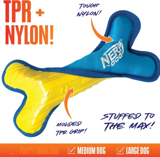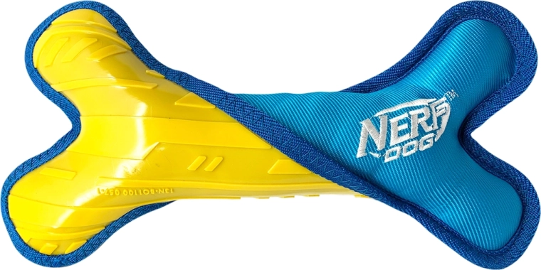 Kość Nerf Dog oferuje sprytne połączenie materiałów, aby zrównoważyć trwałość i wygodę. Wewnątrz znajduje się wytrzymały rdzeń z TPR dla długiej żywotności, natomiast zewnętrzna warstwa z pluszowego nylonu jest delikatna dla zębów i dziąseł. Wewnętrzna wypełnina z polietylenu nadaje objętość i atrakcyjną fakturę, która motywuje psy do zabawy.