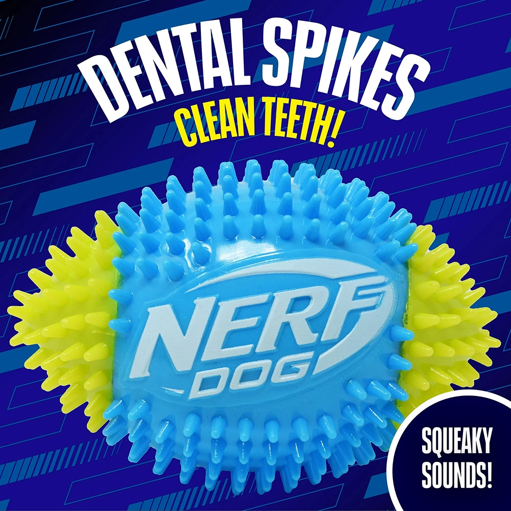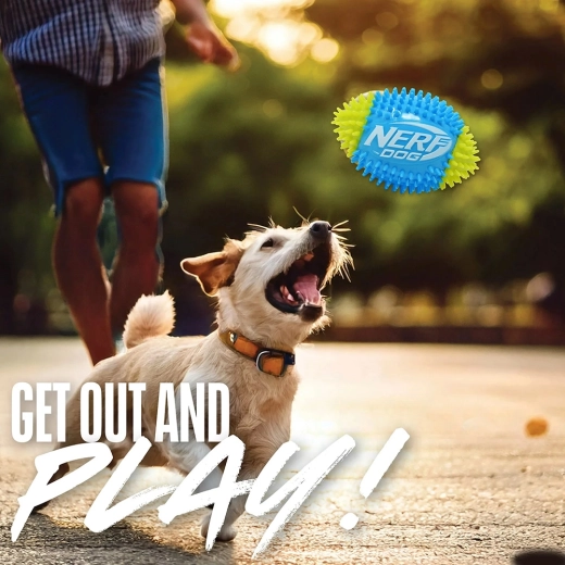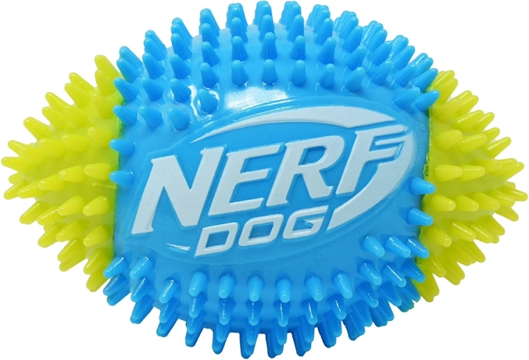 Zabawka Nerf Dog piszcząca piłka nożna z wypustkami zapewnia dynamiczną, interaktywną rozrywkę dla psów, które kochają ruch. Wytrzymała termoplastyczna guma (TPR) gwarantuje elastyczność, długą żywotność i delikatność dla zębów. Teksturowana powierzchnia z wypustkami poprawia chwyt przy aportowaniu, a jednocześnie wspiera naturalne żucie i masuje dziąsła.