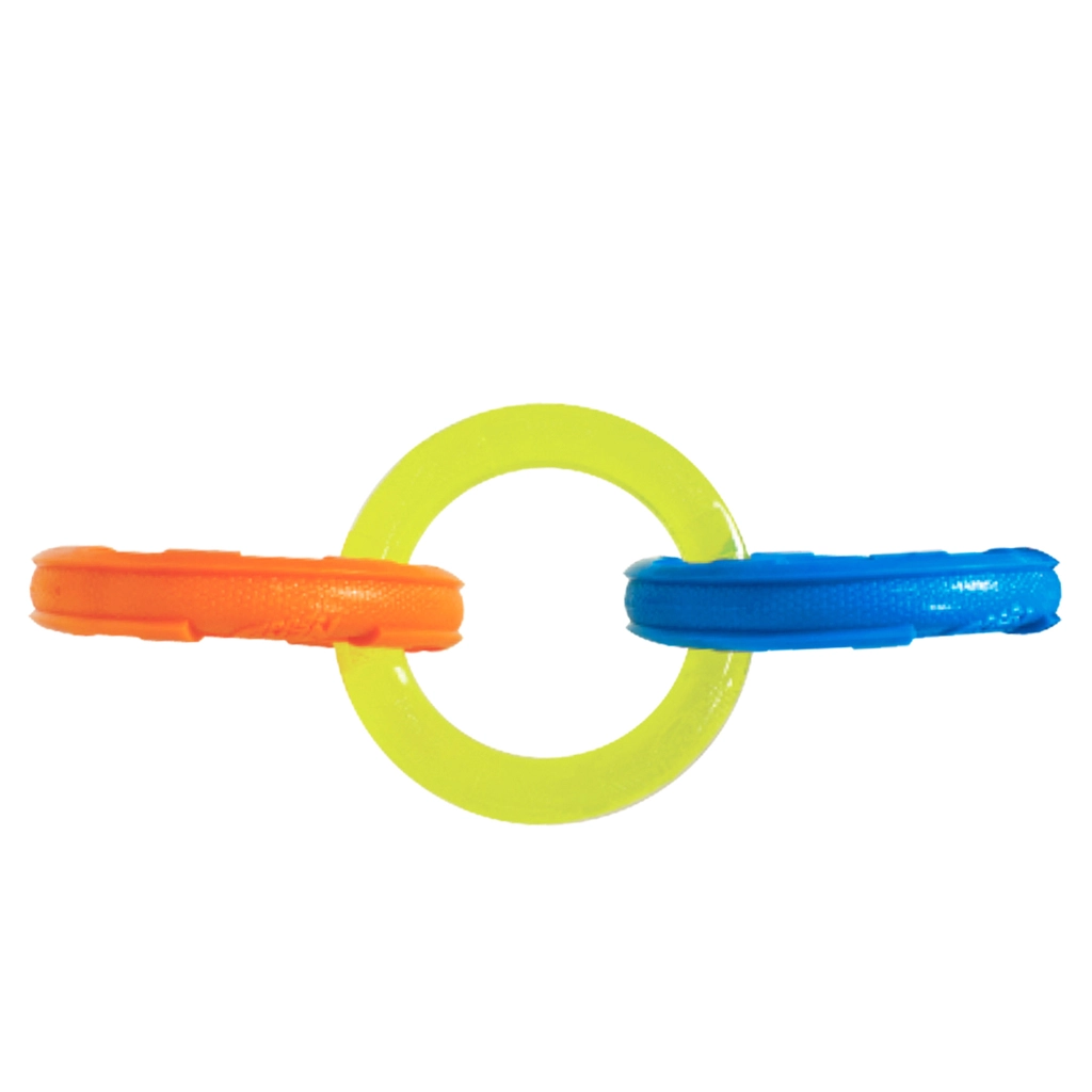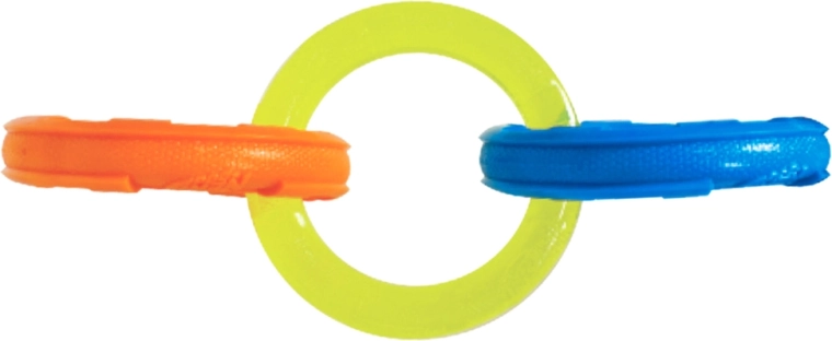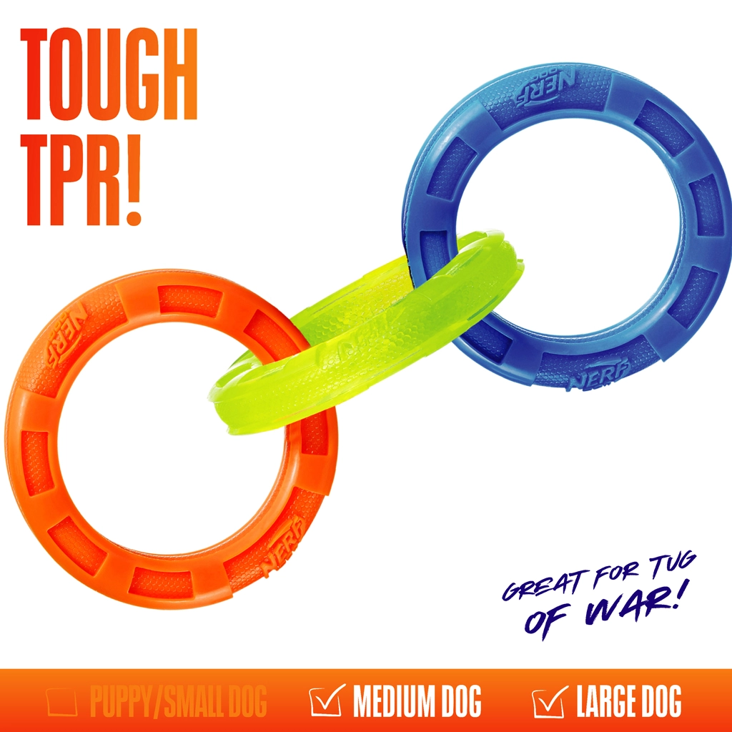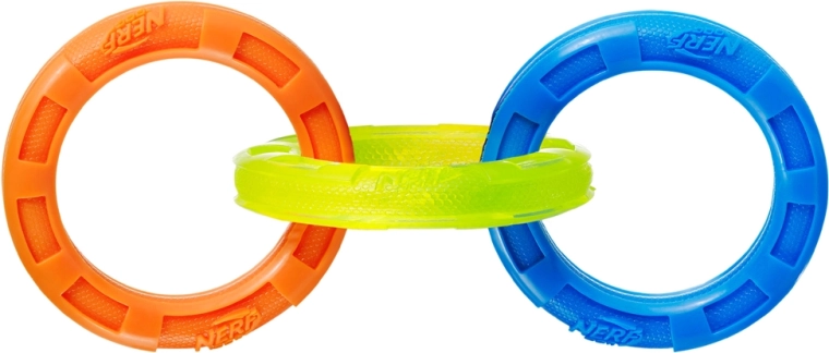 Wytrzymała interaktywna zabawka dla psów z trzema połączonymi pierścieniami do przeciągania i aportowania. Dzięki długości 26,7 cm idealna dla ras średnich i dużych. Wodoodporna konstrukcja, tekstura z wypustkami dla zdrowych zębów i dziąseł oraz lekkie, a jednocześnie wyjątkowo odporne materiały Nerf Tough zapewniają długą zabawę i bezpieczeństwo zarówno na zewnątrz, jak i w domu.