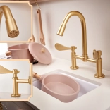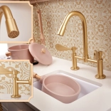 Głęboki zlew z metalicznie złotym kranem i podwójnymi uchwytami zachęca do zabawy w mycie i przygotowanie. Praktyczne półki i szafki pomagają trzymać wszystko pod ręką.