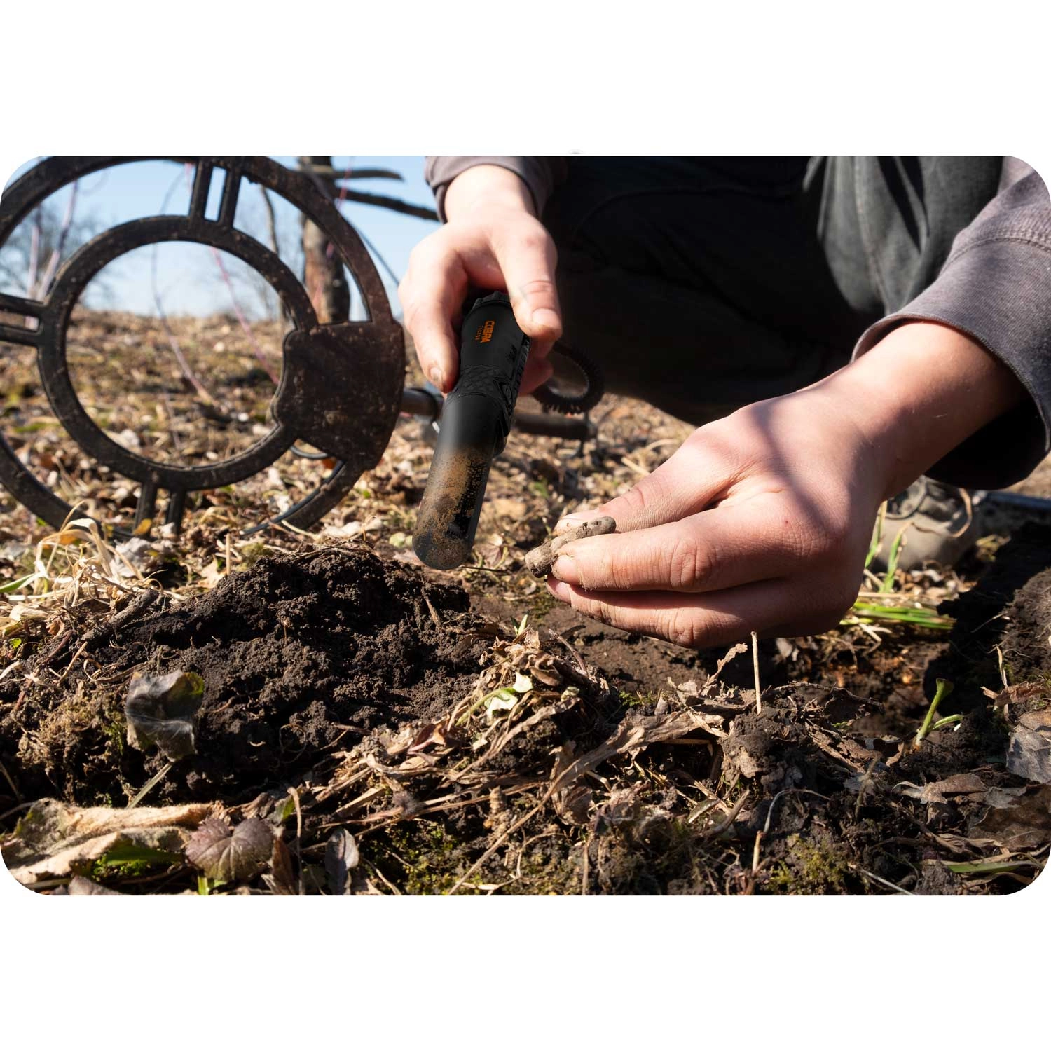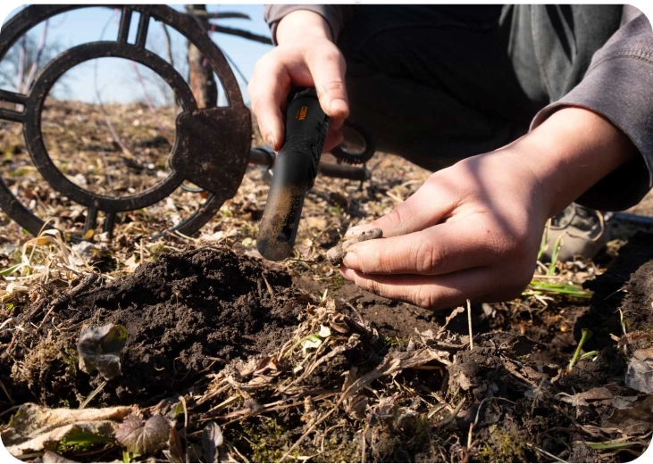 Wykrywaj cel na całym obwodzie sondy, a ostatecznie namierz go końcówką, co przyspiesza i ułatwia czyste wydobycie znaleziska.