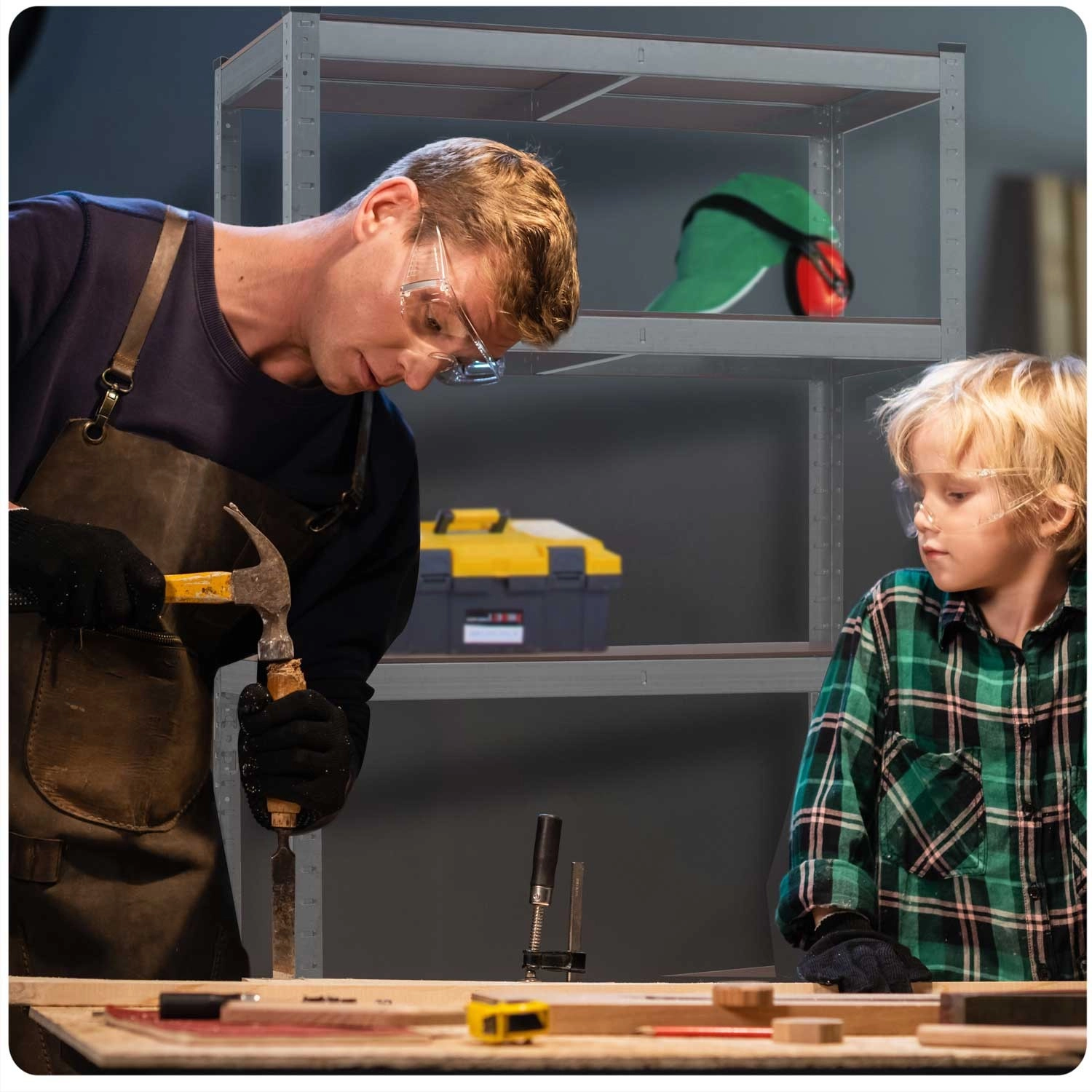 Dzięki sprytnemu bezśrubowemu systemowi montaż jest szybki i czysty – półki łatwo ustawisz na wymaganej wysokości w skokach co 40 mm. Regał można rozdzielić na dwa mniejsze elementy dla jeszcze większej elastyczności aranżacji lub przekształcić w praktyczny stół roboczy do warsztatu.