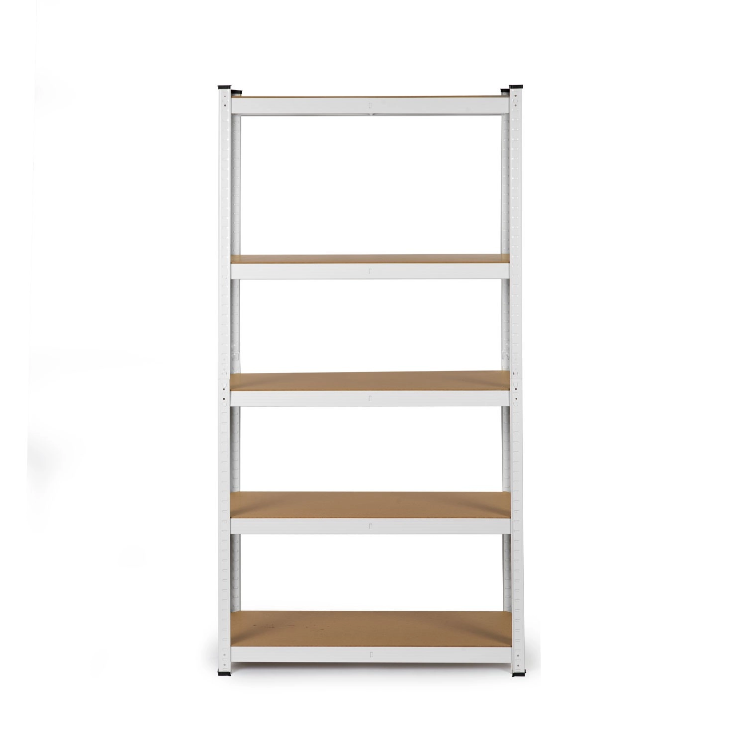 Solidna stalowa rama z powłoką proszkową, półki MDF i centralne wzmocnienia zapewniają nośność do 175 kg na półkę, łącznie 875 kg.