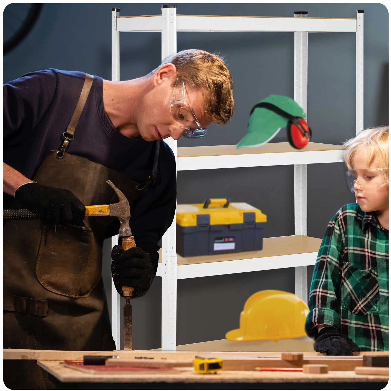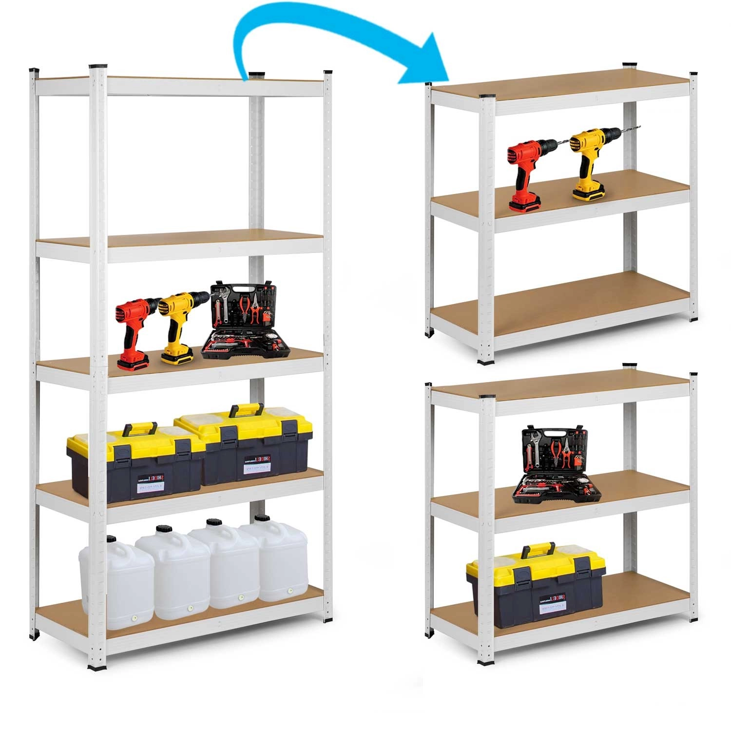 Uniwersalny i stabilny metalowy regał HUMBErg w białym kolorze oferuje 5 solidnych półek z MDF, nośność do 875 kg oraz szybki montaż bez śrub. Dzięki regulowanej wysokości półek i możliwości podziału na dwa mniejsze regały doskonale sprawdzi się w garażu, piwnicy, archiwum i warsztacie.