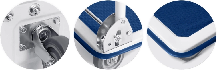 - Stabilność i ochrona – gumowa krawędź, solidne mocowanie kół, ocynkowane zawiasy