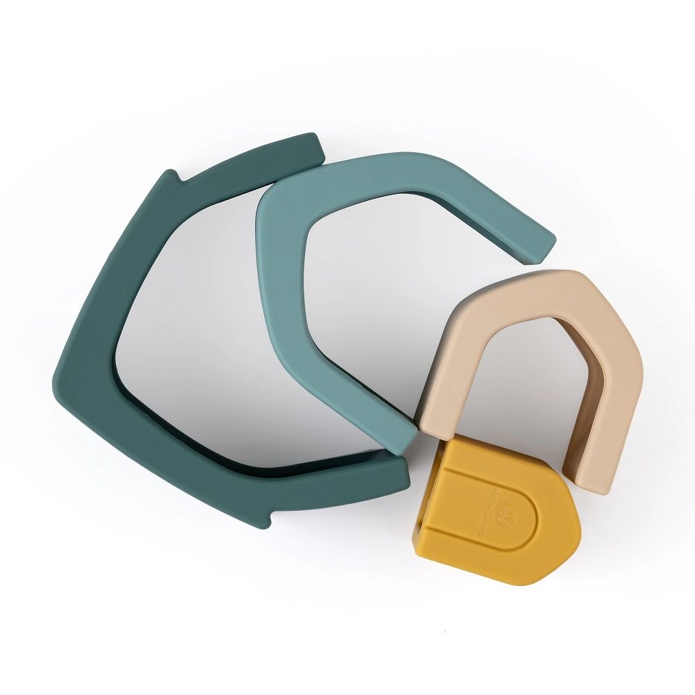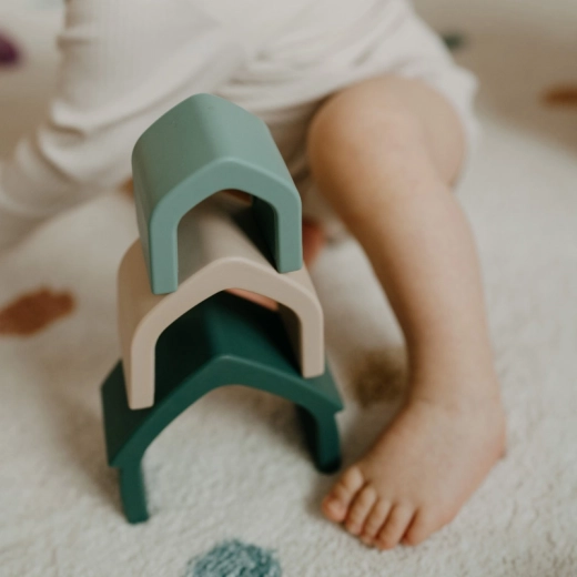 Zestaw czterech łukowatych elementów pozwala dzieciom budować, sortować, układać warstwowo oraz odkrywać kształty i kolory. Otwarta zabawa bez sztywnych reguł pobudza kreatywność i wspiera samodzielne odkrywanie. Dzięki miękkiemu, elastycznemu i przyjemnemu w dotyku materiałowi zabawka jest odpowiednia dla małych rączek i bezpiecznej manipulacji.