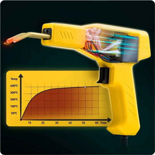 Za pomocą tej kompaktowej zgrzewarki do plastiku naprawisz pęknięcia i złamania w mgnieniu oka – od samochodowych zderzaków, przez klosze reflektorów, po elementy sprzętów domowych. Dzięki szybkiemu wzrostowi do 400 °C w 5 sekund i mocy 50 W oszczędzasz czas i koszty serwisu. Lampka LED precyzyjnie oświetla miejsce pracy, a ergonomiczny spust umożliwia wygodne dozowanie ciepła.
