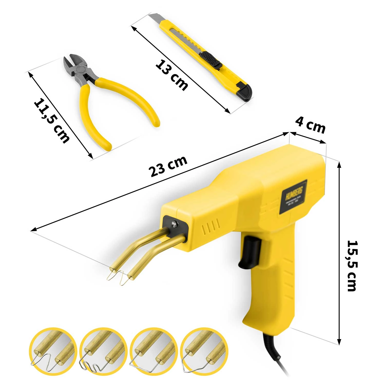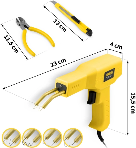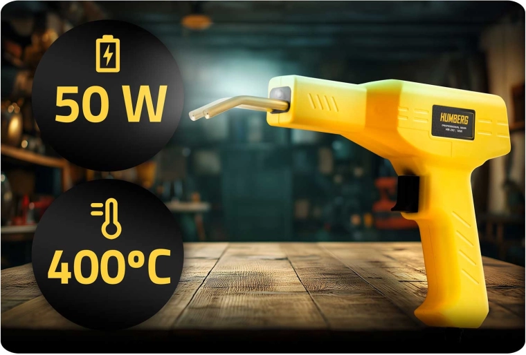 Praktyczna zgrzewarka do plastiku HUMBERG o mocy 50 W z nagrzewaniem w 5 s do 400 °C jest idealna do szybkich napraw zderzaków, obudów urządzeń i elementów wnętrz pojazdów. Kompletny zestaw w kuferku zawiera 200 szt. spinek w 4 typach, oświetlenie LED, obcinak oraz nóż z odłamywanym ostrzem dla czystego wykończenia. Wytrzymała obudowa z PP nie przegrzewa się i zapewnia łatwą oraz bezpieczną obsługę.