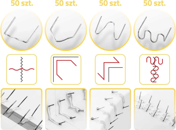 W zestawie znajduje się bogaty komplet 200 spinek w 4 kształtach do różnych typów pęknięć – proste, wewnętrzne i zewnętrzne narożniki oraz szersze uszkodzenia. Po zgrzaniu łatwo usuniesz wystające końcówki obcinakiem, a powierzchnię wyrównasz nożem z odłamywanym ostrzem dla czystego efektu, gotowego do ewentualnego szlifowania lub lakierowania.