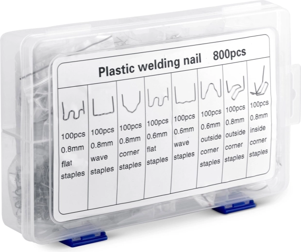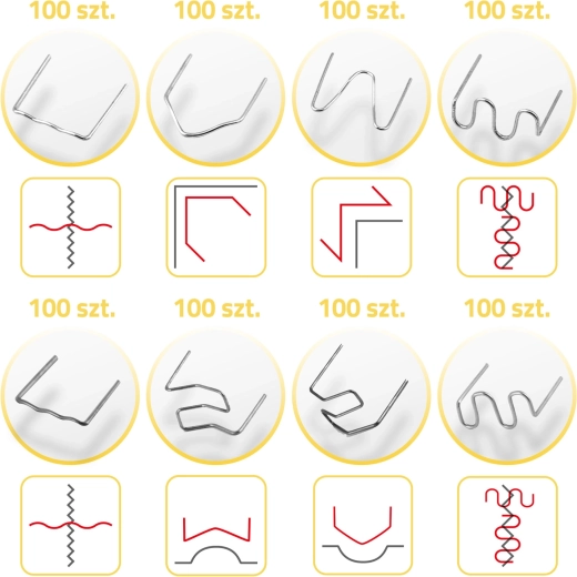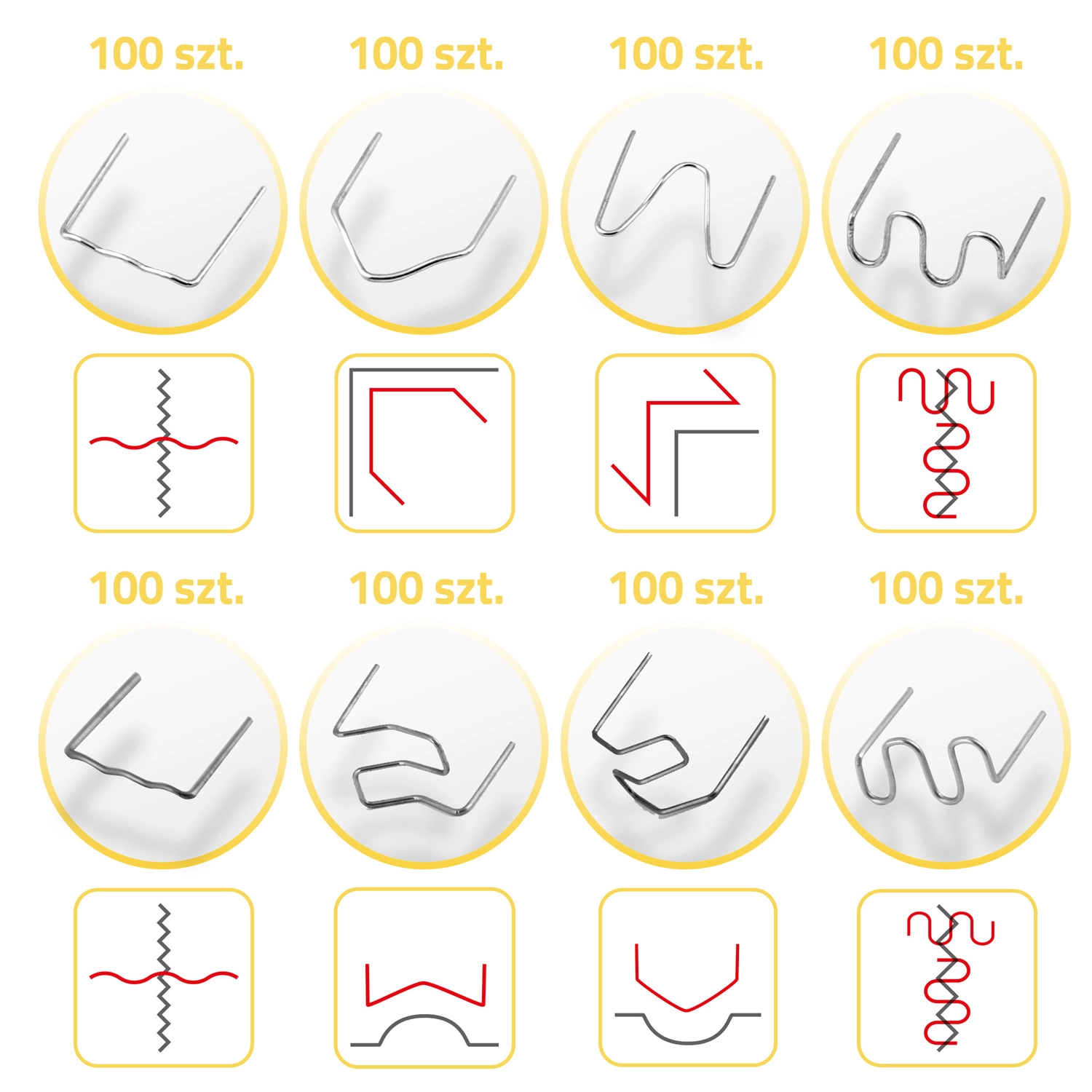 Zawartość zestawu została zaprojektowana tak, aby pokryć najczęstsze rodzaje uszkodzeń tworzyw – od wąskich pęknięć po szerokie złamania, wewnętrzne i zewnętrzne rogi oraz powierzchnie zakrzywione. Wszystko umieszczono w przejrzystej walizce, dzięki czemu potrzebny typ zszywki zawsze szybko znajdziesz.