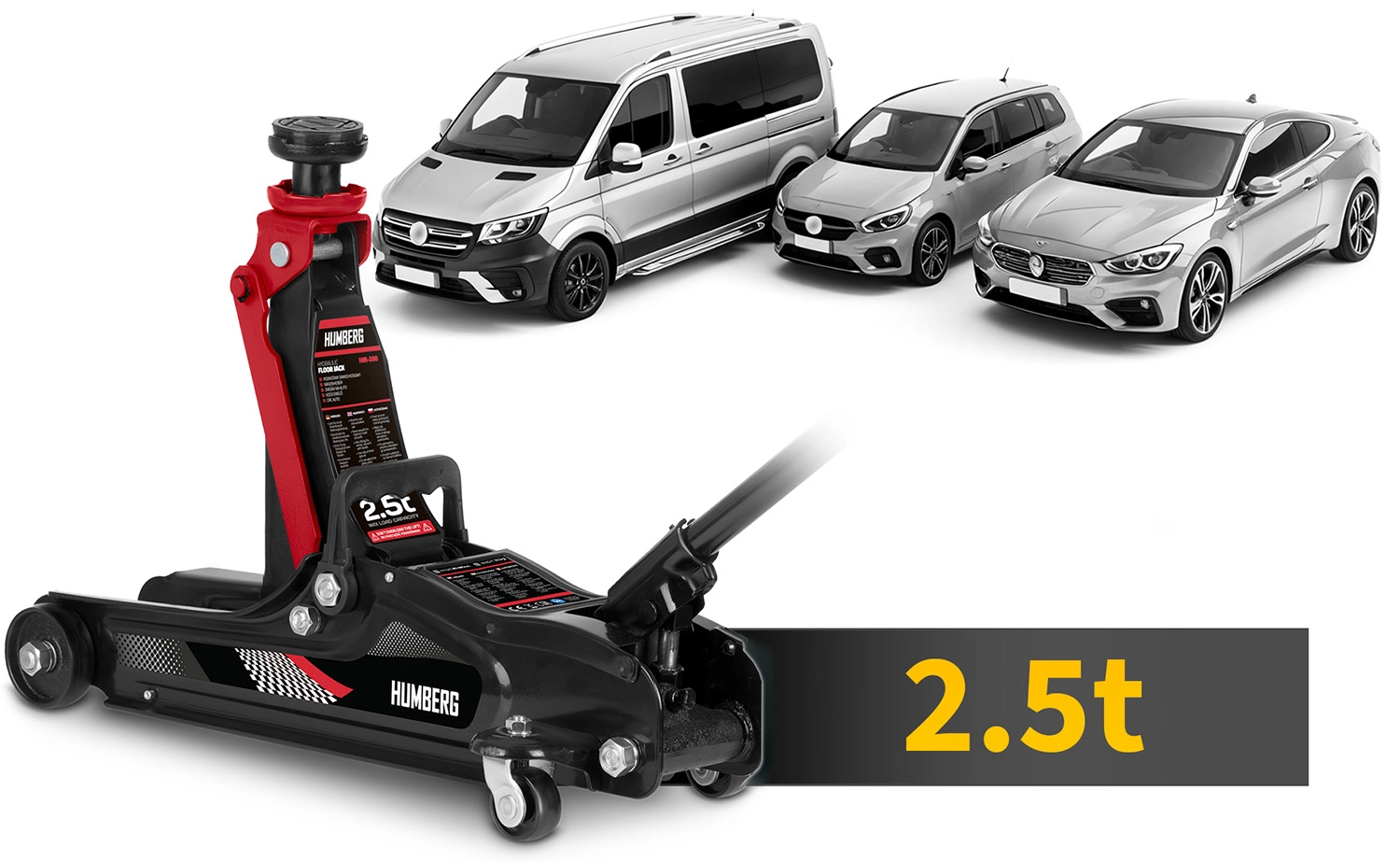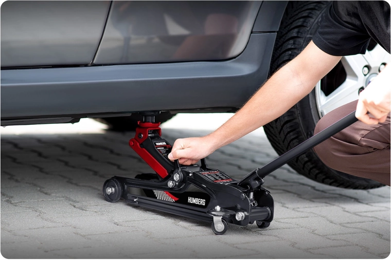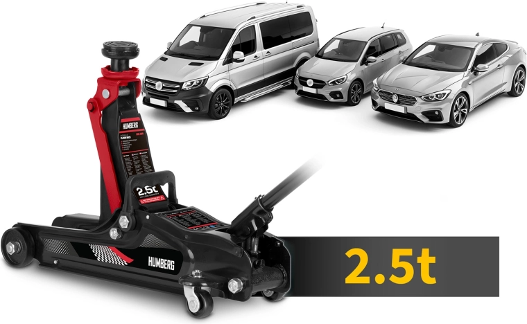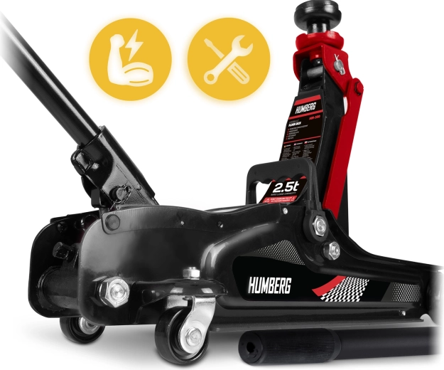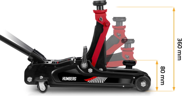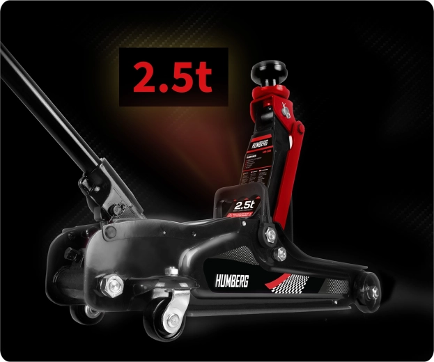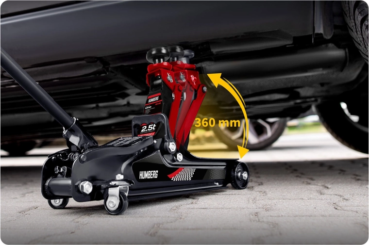 Wydajny niskoprofilowy podnośnik hydrauliczny HUMBERG o udźwigu 2,5 t niezawodnie podniesie samochody osobowe i małe dostawczaki. Dzięki zakresowi podnoszenia 80–360 mm wsuwa się nawet pod niskie auta, ma stalowo‑aluminiową konstrukcję, 360° obrotowe kółka dla łatwego manewrowania i zawiera wymienne gumowe nakładki oraz dodatkową stalową głowicę dla lepszego dopasowania do różnych progów.