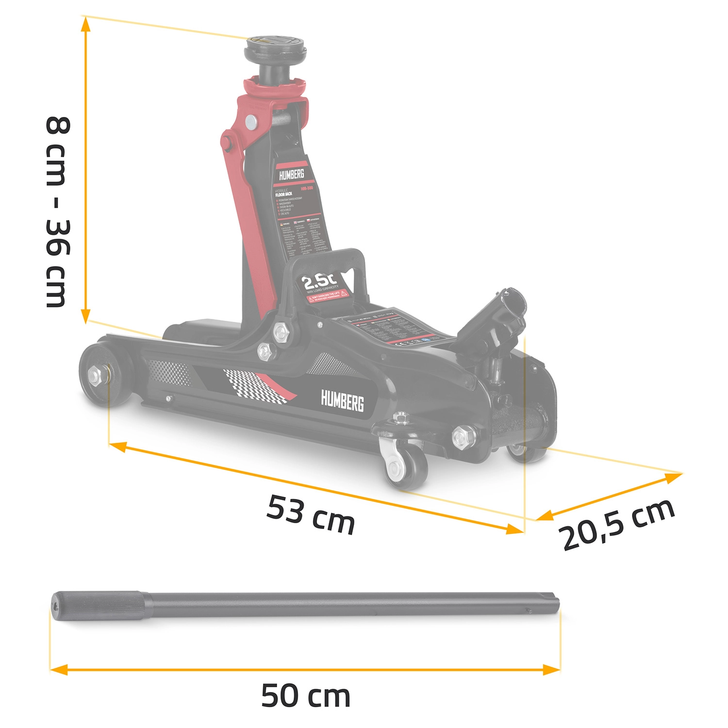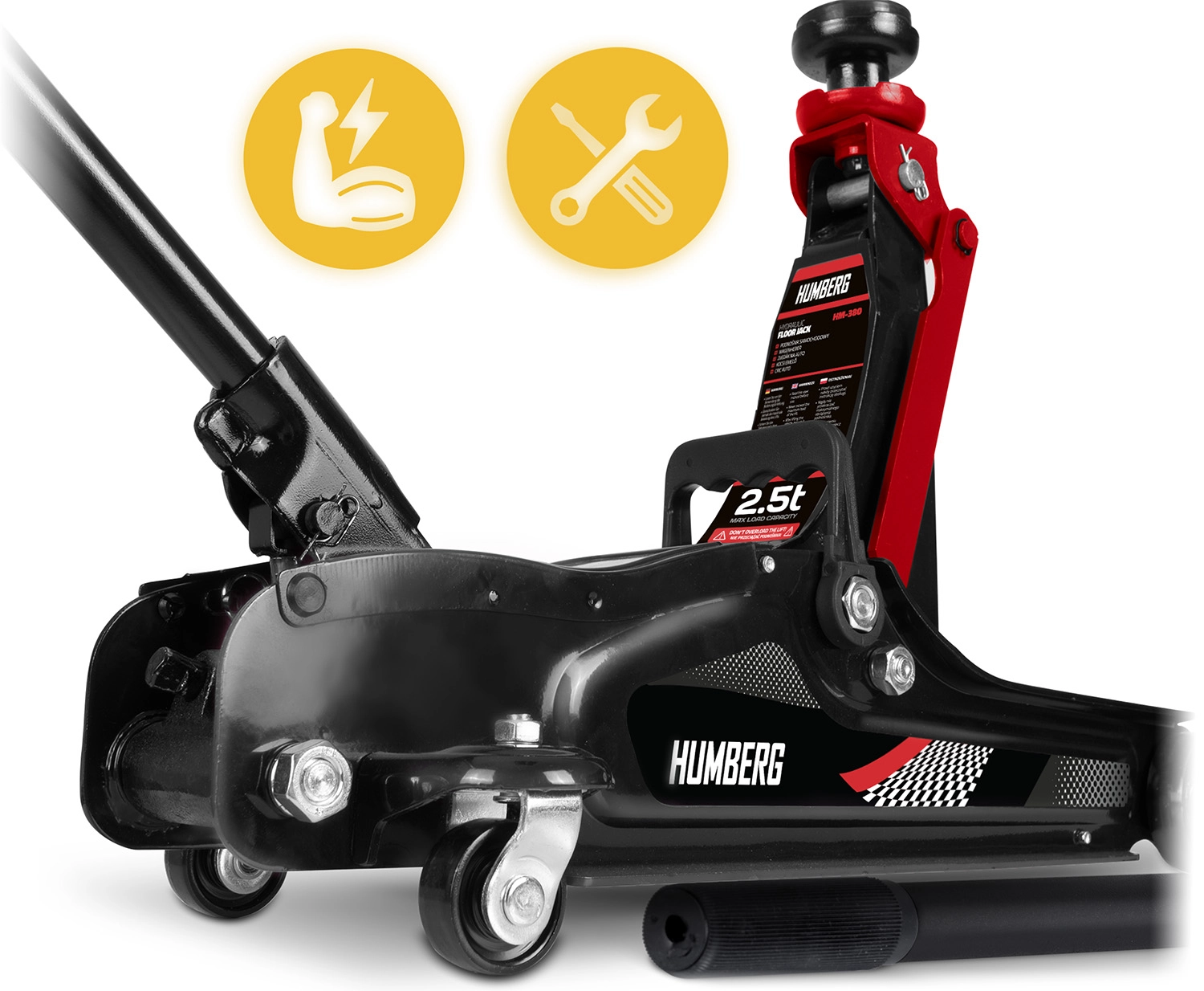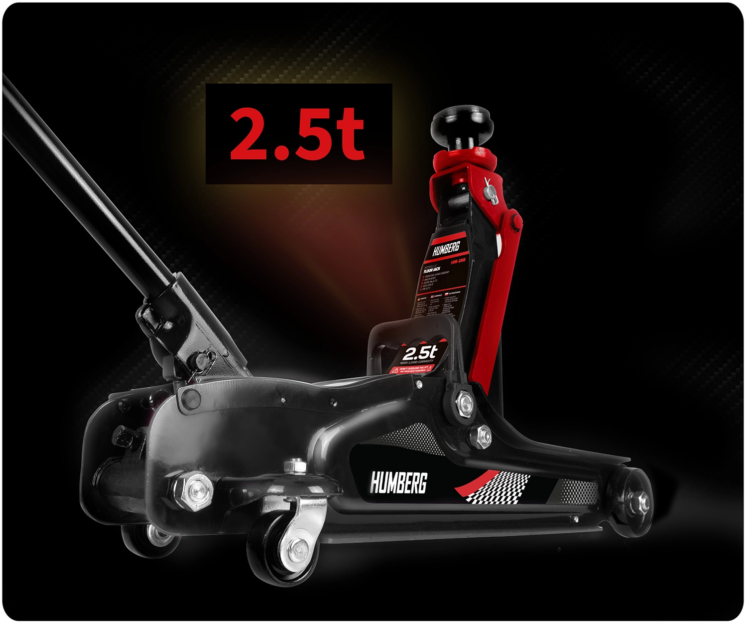 Wydajny niskoprofilowy podnośnik hydrauliczny HUMBERG o udźwigu 2,5 t niezawodnie podniesie samochody osobowe i małe dostawczaki. Dzięki zakresowi podnoszenia 80–360 mm wsuwa się nawet pod niskie auta, ma stalowo‑aluminiową konstrukcję, 360° obrotowe kółka dla łatwego manewrowania i zawiera wymienne gumowe nakładki oraz dodatkową stalową głowicę dla lepszego dopasowania do różnych progów.