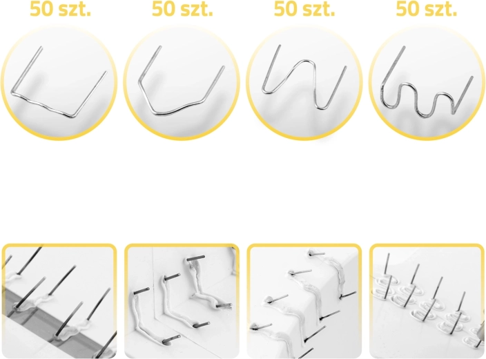 W zestawie znajdują się 4 typy zszywek (4×50 szt.) do różnych pęknięć oraz dodatkowo 600 uniwersalnych falistych zszywek 0,8 mm.